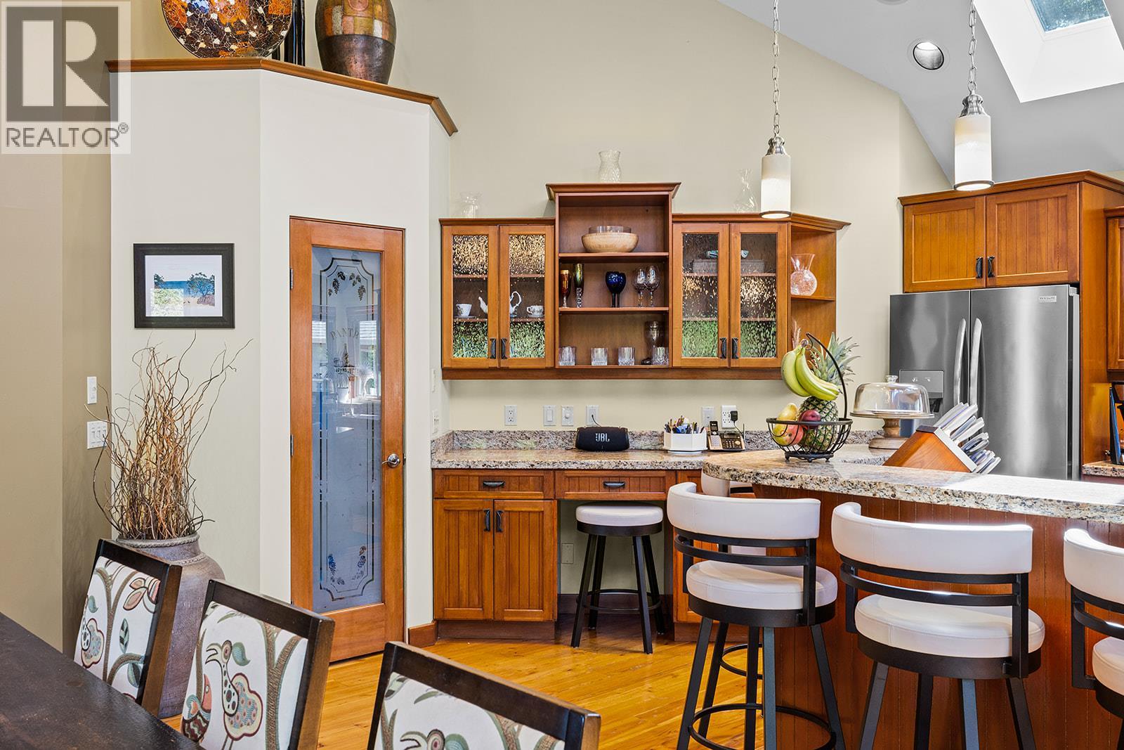 Experience true Okanagan living in Crawford Estates with your own private pool paradise. Featuring brand NEW roofs on both the main home and detached garage, this 6-bedroom, 6-bathroom home seamlessly blends timeless craftsmanship with modern comfort on a private, beautifully landscaped 0.4-acre lot. The striking exterior showcases timber and stone accents with dramatic rooflines that set the tone for the elegance within. Step inside to soaring vaulted ceilings, oversized windows, and a bright, open-concept design that fills the home with natural light. The chef-inspired granite kitchen features built-in appliances, a massive island, and abundant storage perfect for everyday living and entertaining. The spa-like primary suite offers a jetted tub, luxurious finishes, and tranquil views of the surrounding landscape. The walkout basement is an entertainer’s dream, complete with a custom bar, media lounge, and direct access to your private backyard oasis featuring a heated saltwater pool, hot tub, rock waterfall, and lush gardens. A detached, heated two-level garage/workshop adds versatility with its own bathroom, sauna, and wine cellar, ideal for hobbies, guests, or additional living space. With four covered parking spots, RV space, and ample room for family and visitors, this home perfectly balances function and sophistication. Nestled in one of Kelowna’s most desirable neighborhoods, Crawford Estates is known for its proximity to parks, trails, and top-rated schools. (id:6770)