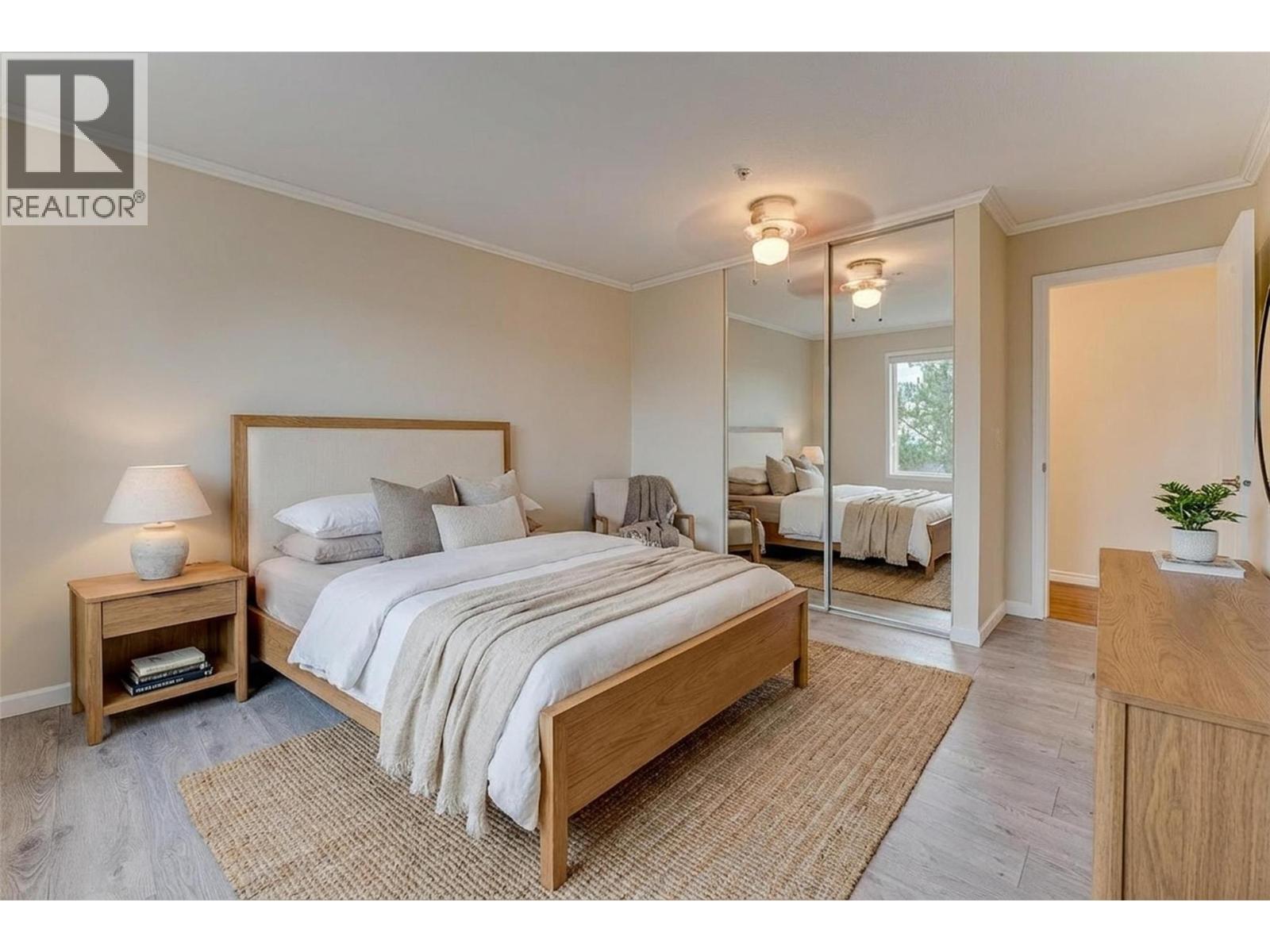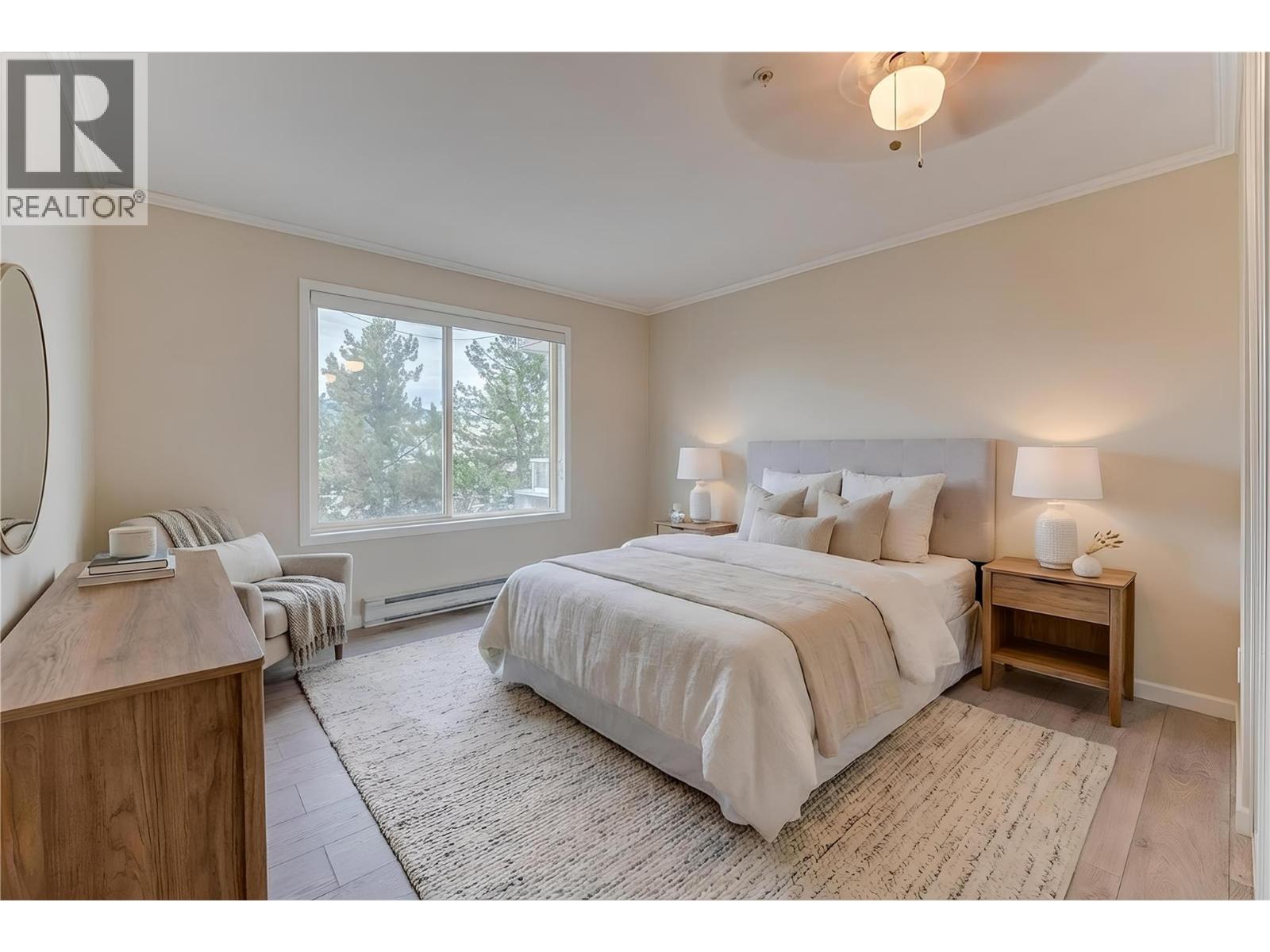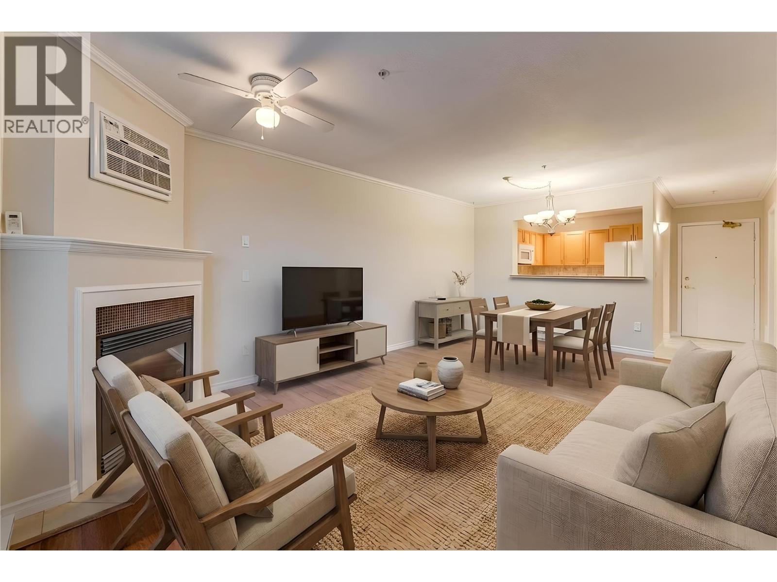 Welcome to Unit #102 at Imperial Ridge. With a fresh coat of paint, recently updated flooring, and a lovely kitchen, this 2-bedroom, 2-bathroom condo is truly move-in ready. The home is located in a well-maintained, all-ages building that has undergone extensive upgrades since 2022, including parkade improvements, building envelope work (windows, decks, stucco), a new elevator, and refreshed hallways with modern carpeting, lighting, and paint. Ideally located just steps from downtown Vernon’s shops, cafes, medical offices, and services, this quiet, south-facing home is filled with natural light and enjoys beautiful city views, with glimpses of Okanagan Lake. The spacious layout offers a modern kitchen with plenty of storage, opening into the dining area and comfortable living room. Enjoy the cozy gas fireplace on cooler days (natural gas included in the strata fee), and in summer relax on your private deck or stay cool with the newer wall-mounted A/C unit. The primary bedroom features a walk-in closet and full ensuite, while the second bedroom and full main bathroom provide flexibility for guests, a home office, or family. In-suite laundry with newer washer and dryer adds everyday convenience. Additional features include one secure underground parking stall, a storage locker, bike storage, and a common room. Strata fees include hot water, water, sewer, garbage, natural gas. Book your showing today! (id:6770)