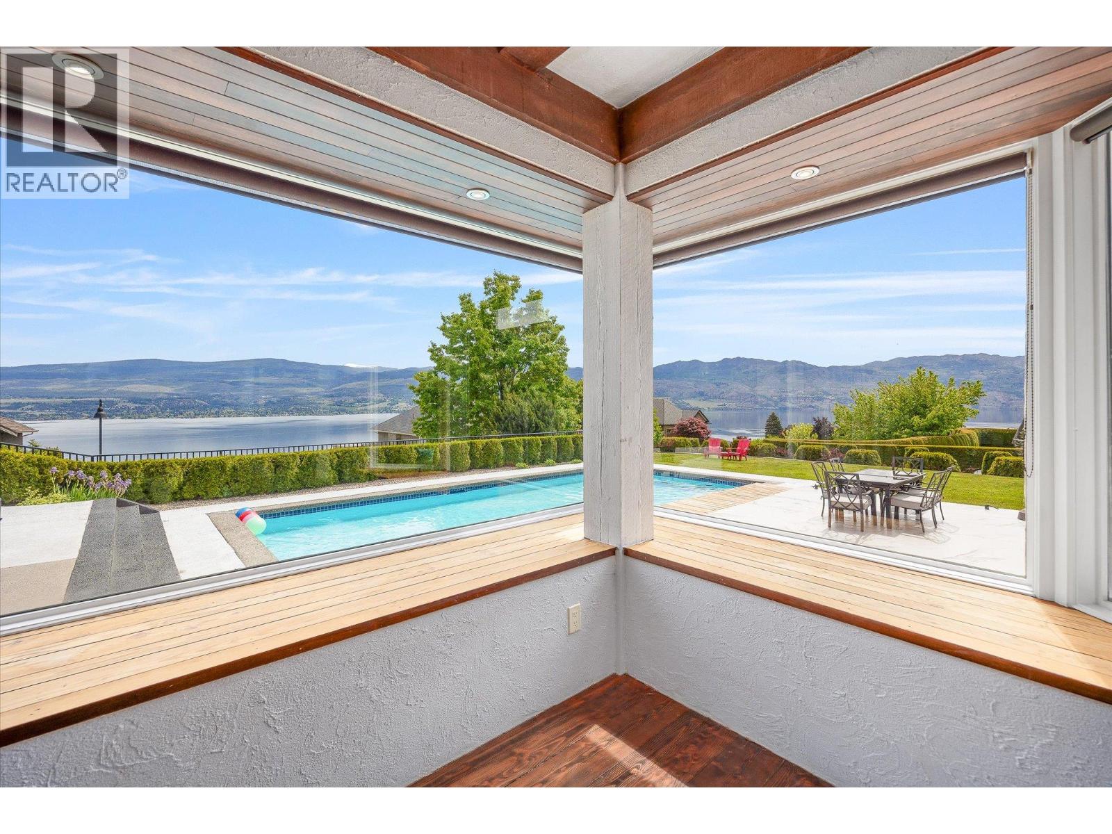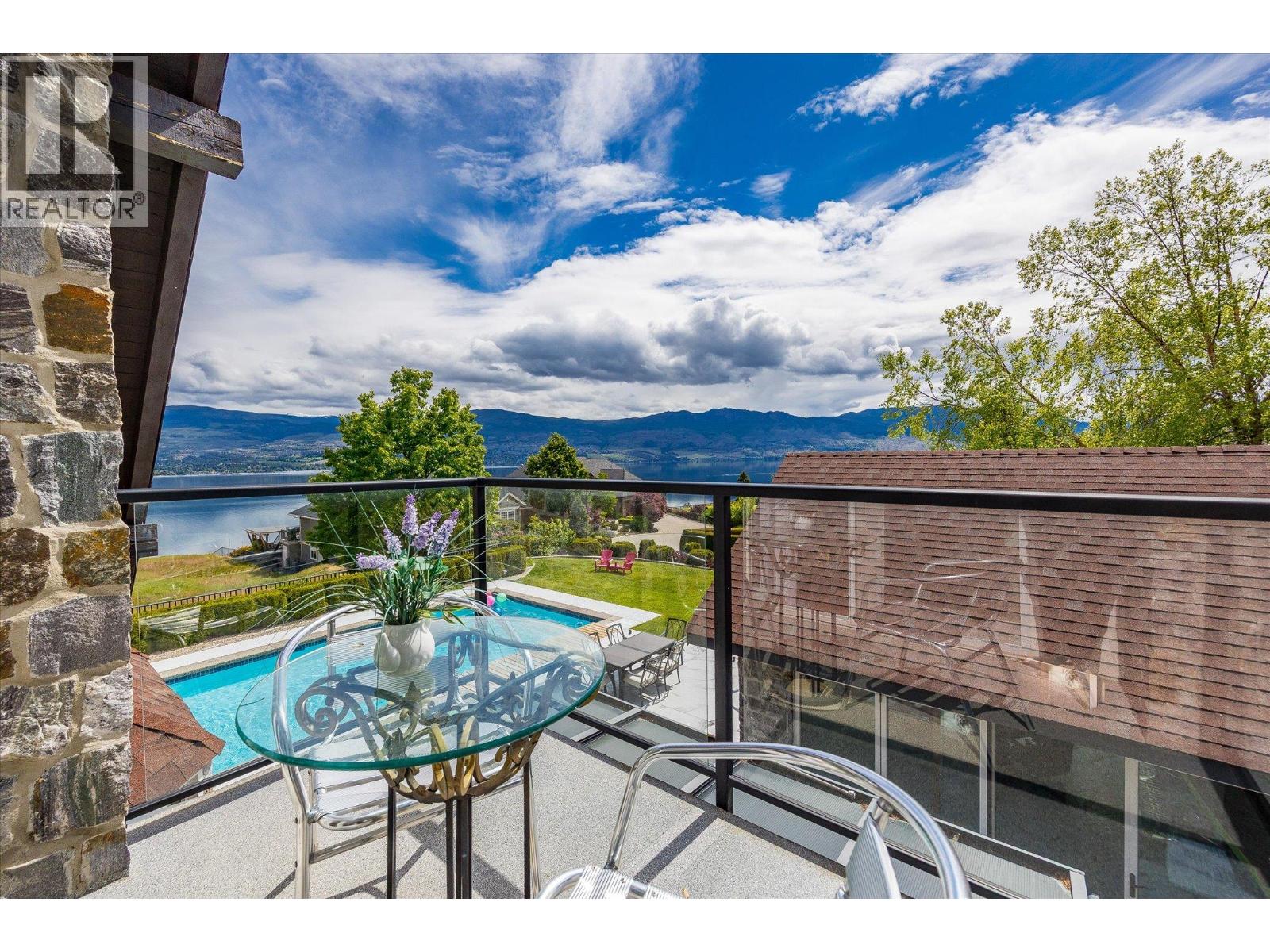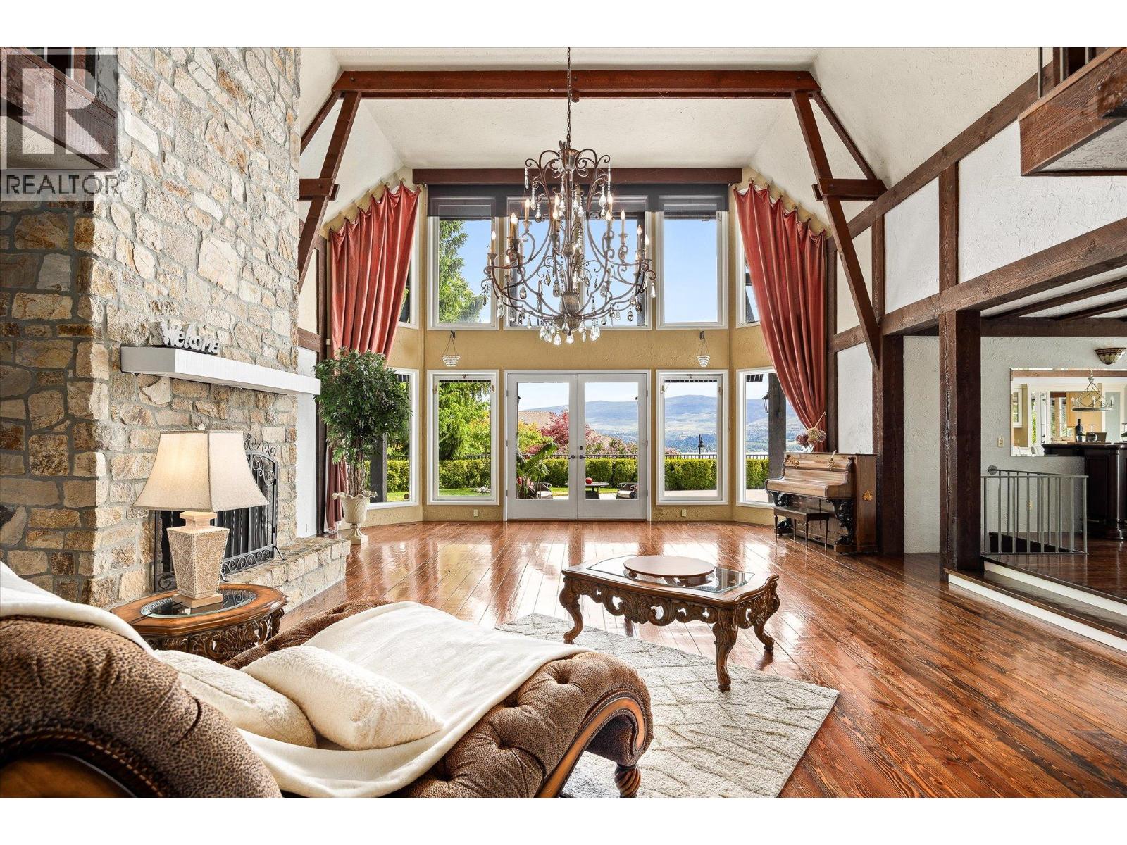 Set on a beautifully landscaped half-acre lot in the exclusive gated community of Thacker Ridge Estates, this remarkable estate home blends luxury, rustic charm, and timeless character. Enjoy breathtaking Okanagan Lake views from your private pool and patio, surrounded by an immaculately maintained yard. Inside, the home is filled with unique touches — rustic wood beams, soaring 20 foot ceilings, and charming secret passages. A grand double-door entrance leads to a sunken living room with a dramatic fireplace and a full wall of windows framing the lush outdoors. The entertainer’s kitchen offers a thoughtful layout with dual sinks, a gas cooktop, double ovens, an oversized fridge-freezer with custom cabinetry, and an adjoining statement dining room perfect for hosting. Upstairs, three spacious bedrooms each feature ensuites, creating private, tranquil retreats. Bonus spaces include a finished attic and a large basement with a recording studio and media room — not included in the main square footage — with 6’2” ceilings, offering extra flexibility and creative potential. An additional highlight is the cabana, complete with a commercial kitchen, bar, and bathroom, ideal for entertaining in resort-style comfort. This home masterfully balances grandeur and warmth, is minutes away from a number of world-class wineries, golf courses, and a short 5 minute drive from all the daily amenities you need, making it a rare and unforgettable opportunity that is perfect for Okanagan living. (id:6770)