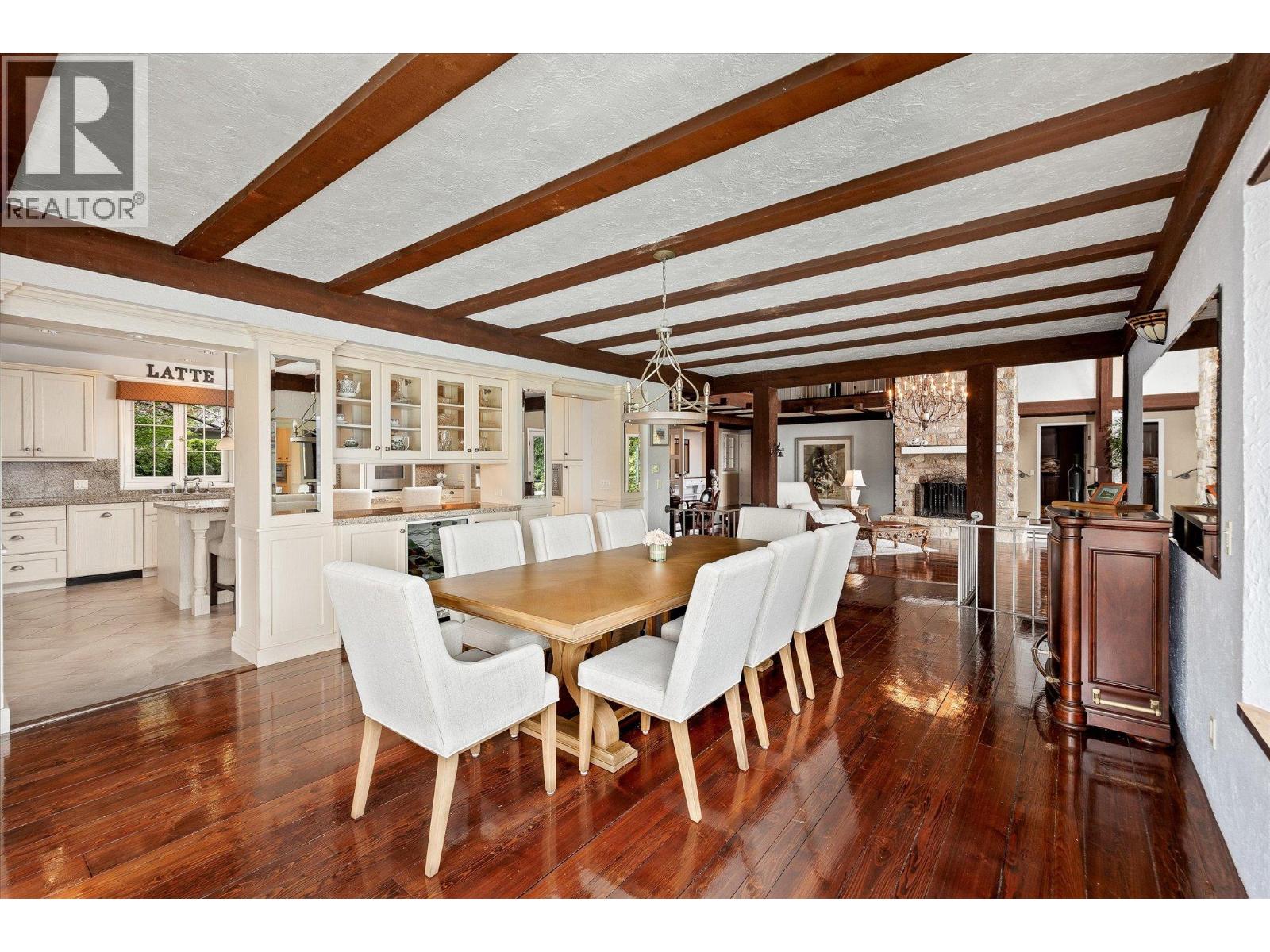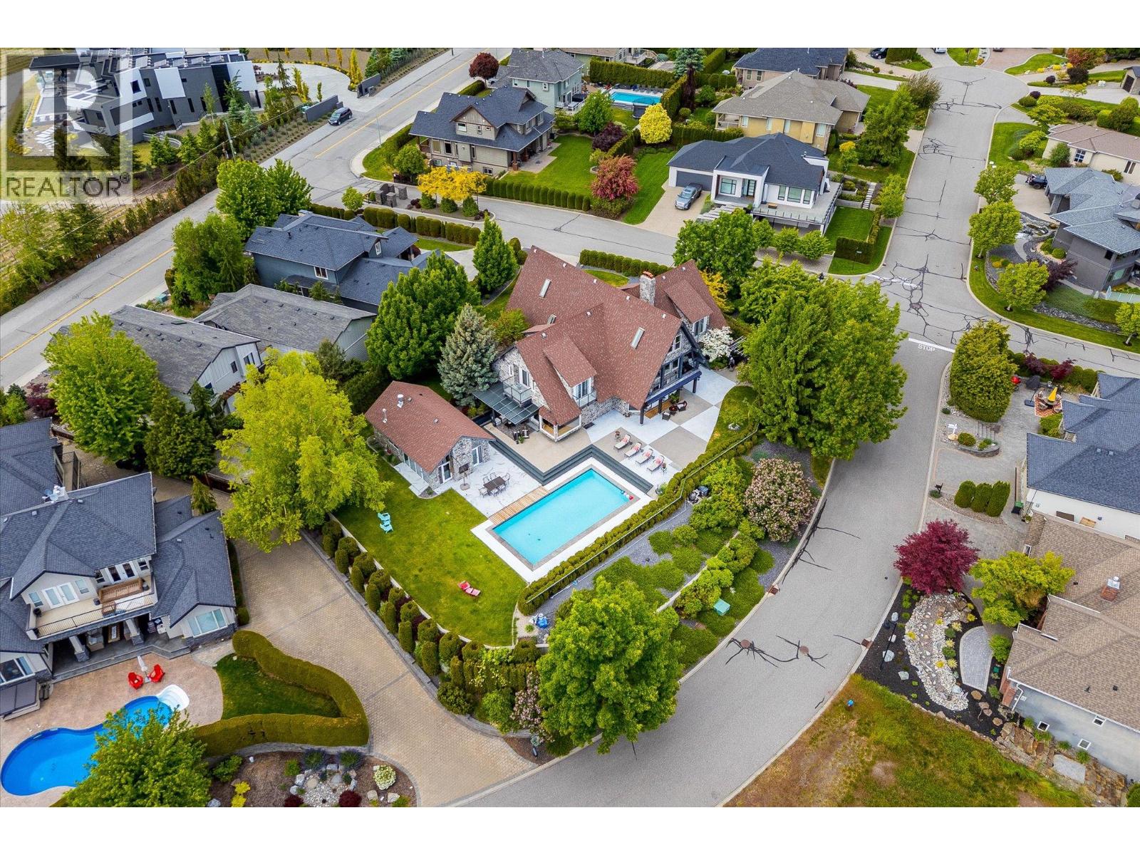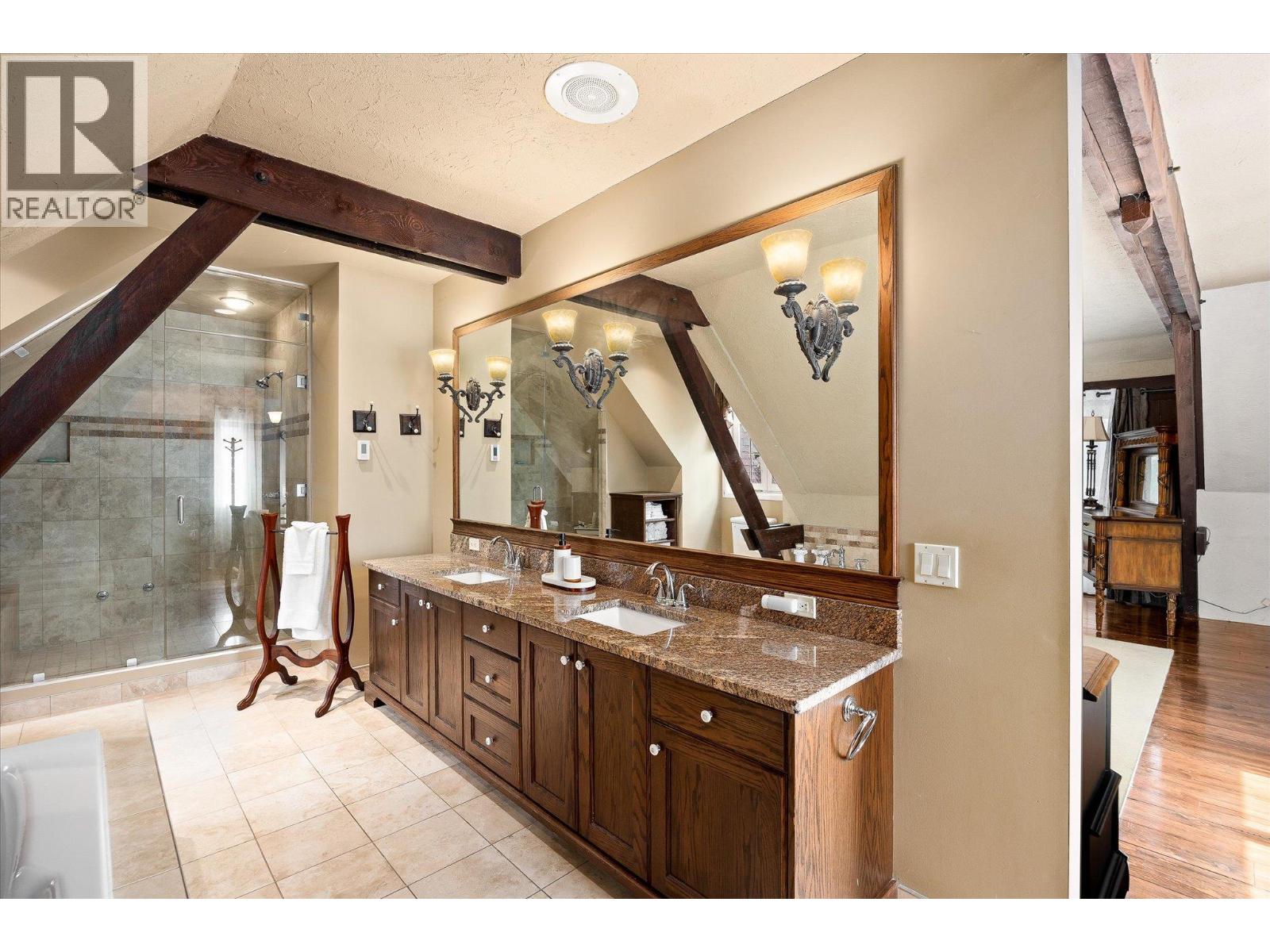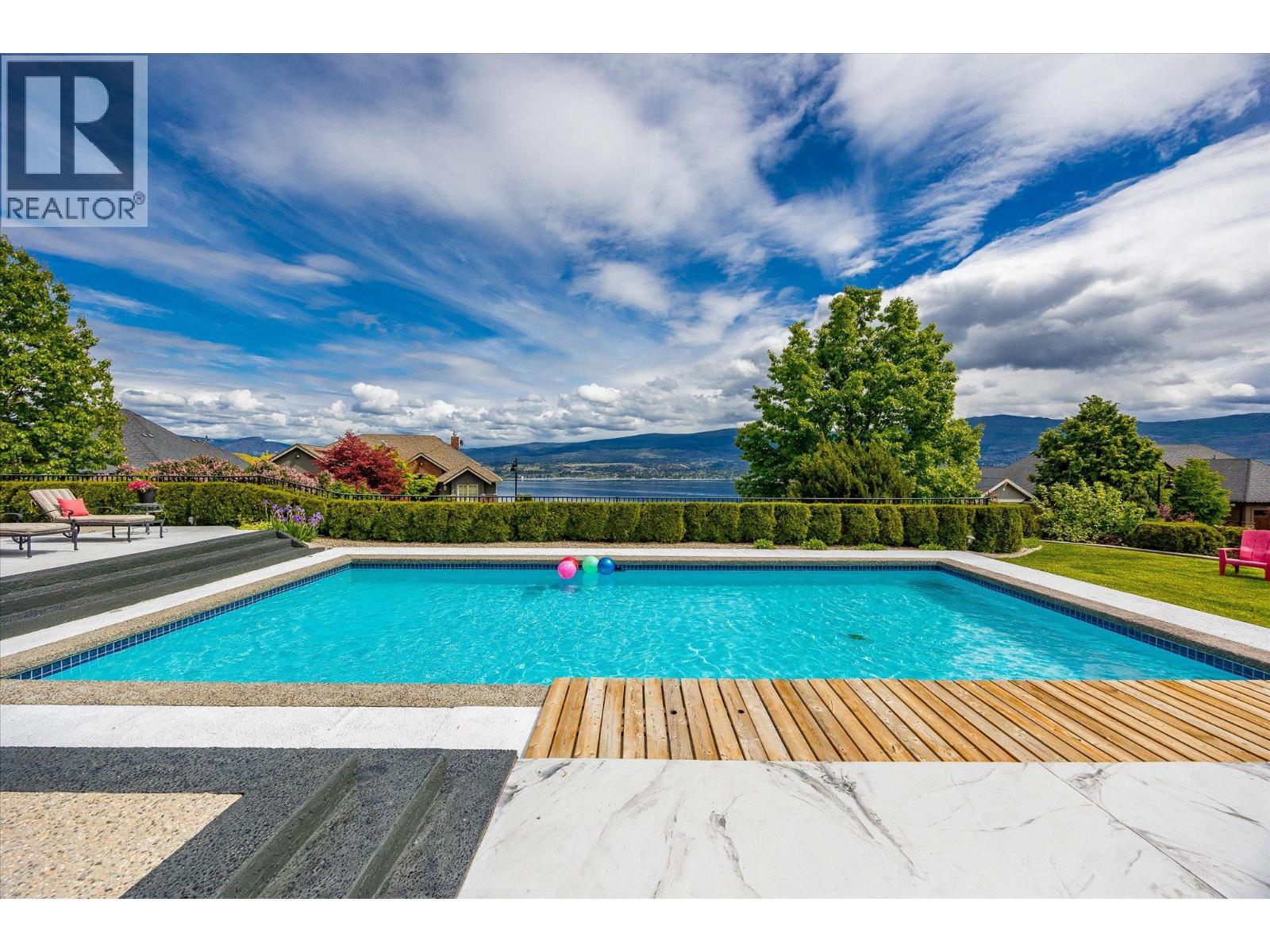 Set on a beautifully landscaped half-acre lot in the exclusive gated community of Thacker Ridge Estates, this remarkable estate home blends luxury, rustic charm, and timeless character. Enjoy breathtaking Okanagan Lake views from your private pool and patio, surrounded by an immaculately maintained yard. Inside, the home is filled with unique touches — rustic wood beams, soaring 20 foot ceilings, and charming secret passages. A grand double-door entrance leads to a sunken living room with a dramatic fireplace and a full wall of windows framing the lush outdoors. The entertainer’s kitchen offers a thoughtful layout with dual sinks, a gas cooktop, double ovens, an oversized fridge-freezer with custom cabinetry, and an adjoining statement dining room perfect for hosting. Upstairs, three spacious bedrooms each feature ensuites, creating private, tranquil retreats. Bonus spaces include a finished attic and a large basement with a recording studio and media room — not included in the main square footage — with 6’2” ceilings, offering extra flexibility and creative potential. An additional highlight is the cabana, complete with a commercial kitchen, bar, and bathroom, ideal for entertaining in resort-style comfort. This home masterfully balances grandeur and warmth, is minutes away from a number of world-class wineries, golf courses, and a short 5 minute drive from all the daily amenities you need, making it a rare and unforgettable opportunity that is perfect for Okanagan living. (id:6770)