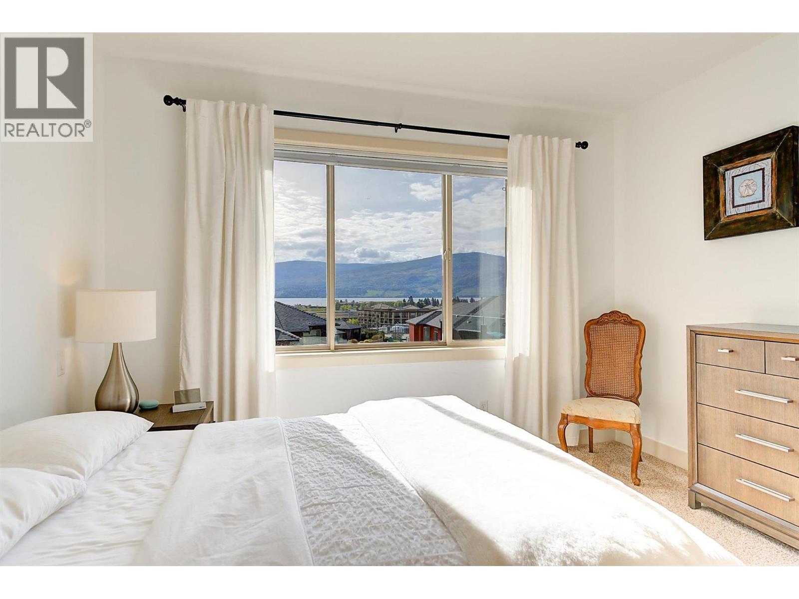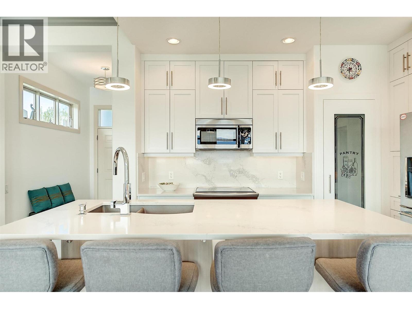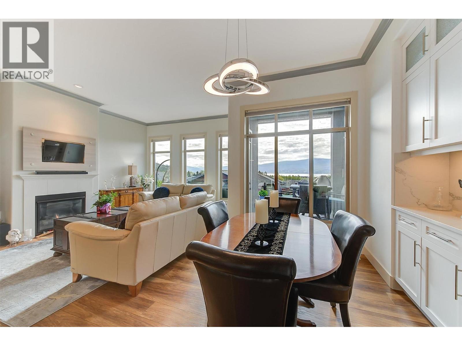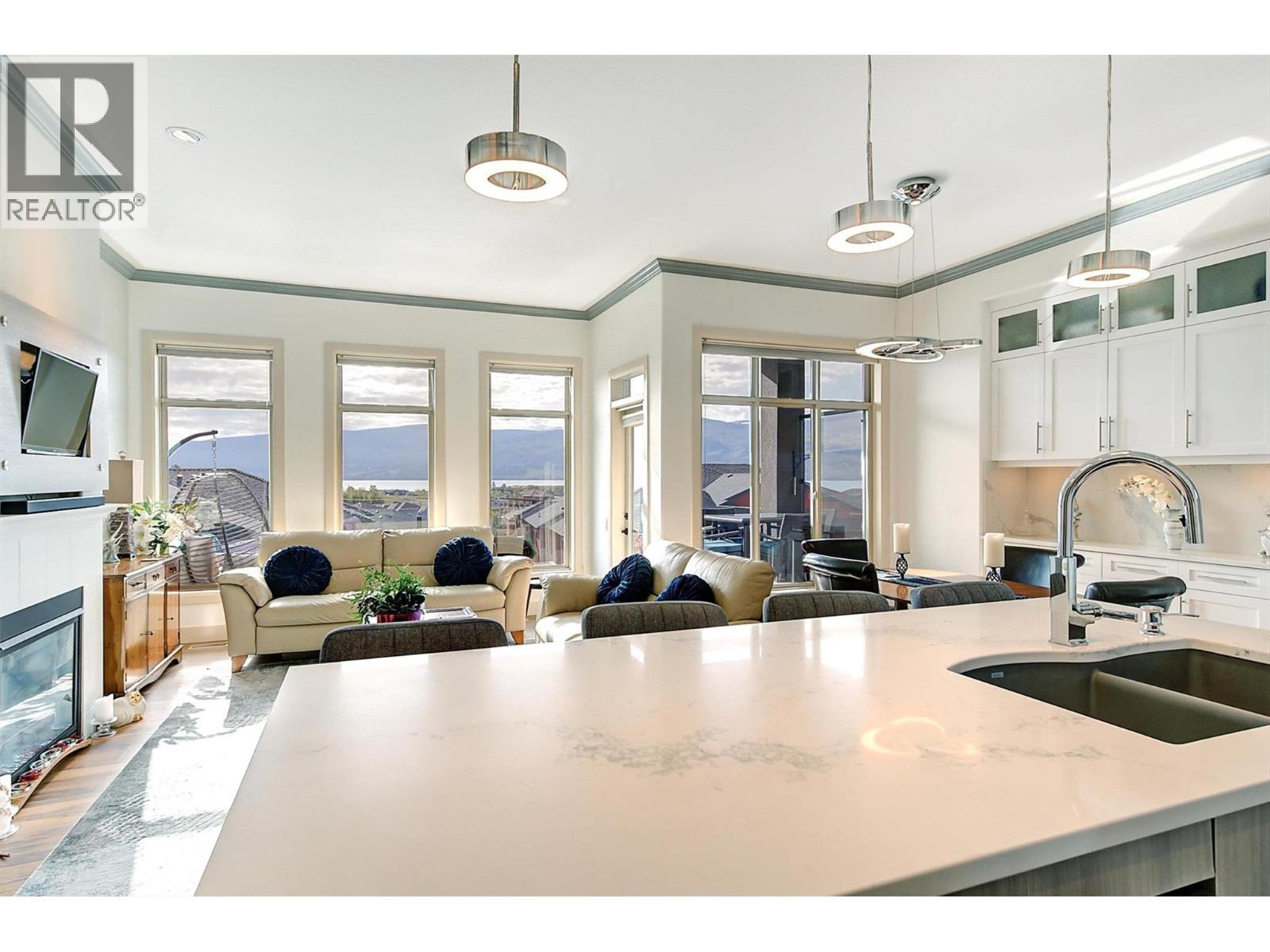 Welcome to this beautifully updated semi-detached townhome in the highly desirable Sonoma Pines community! Step into the stylish, modern custom kitchen featuring white shaker-style soft-close cabinets extended to the ceiling, sleek quartz countertops, stainless steel appliances, a convenient coffee station, a wave-activated Moen kitchen faucet, and updated lighting. The open-concept living room boasts newer laminate flooring, a cozy gas fireplace, and stunning lake views. Adjacent, the dining room includes custom built-in cabinetry and opens onto a spacious deck with topless glass railings—perfect for soaking in the panoramic lake views. The deck also comes equipped with gas hookups for BBQ. The bright and inviting primary bedroom features lake views, newer carpet, a walk-in closet, and a 4-piece ensuite with Corian counters. A second bedroom, full bathroom, and convenient laundry area complete the main floor layout. Downstairs, you'll find a spacious family room with an electric fireplace, a flex room ideal for a home office or gym, a third bedroom, another full bathroom, a large storage room, and access to a lower covered patio with hot tub hookup—perfect for year-round enjoyment. Additional highlights include a double garage, flat driveway, and low-maintenance living in a fantastic location close to golf, shopping, and Okanagan Lake. Sonoma Pines amenities include a clubhouse with gym, library, billiard room, and sizeable social room with a full kitchen available to rent. Secure RV parking is also available on-site. This is the perfect blend of comfort, style, and breathtaking views—don’t miss it. NO PTT, PREPAID LEASE. (id:6770)