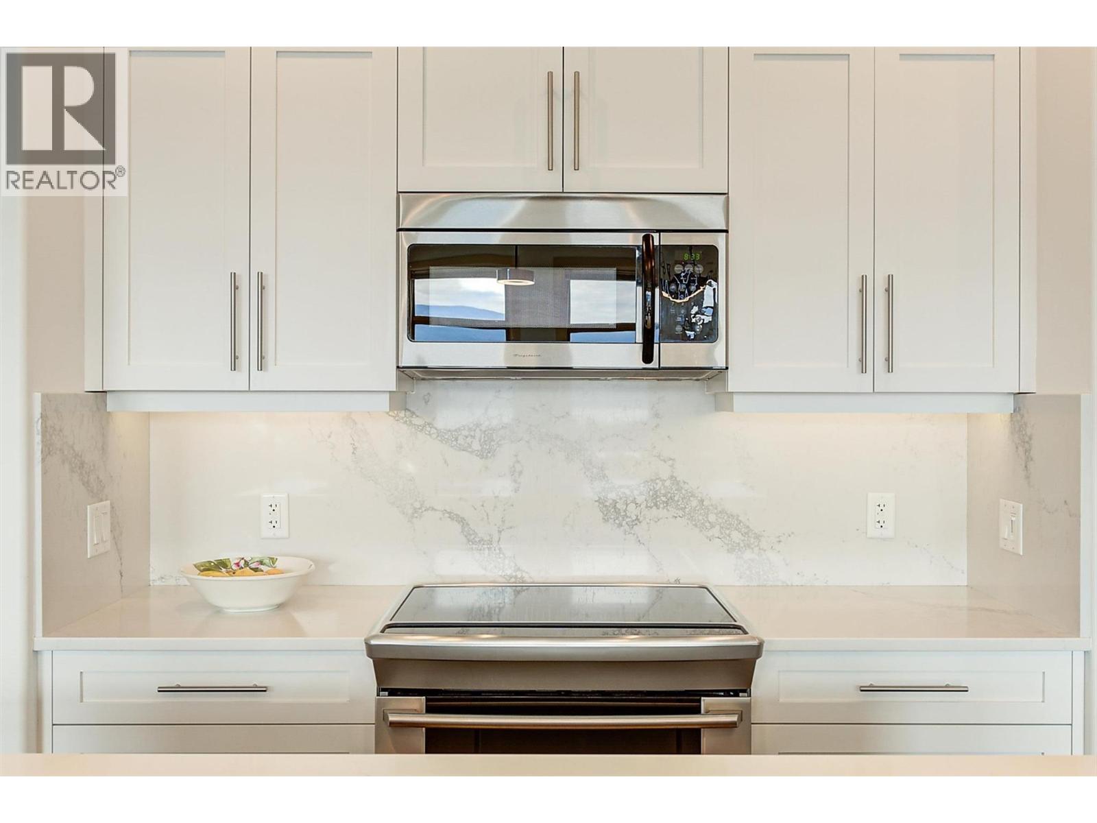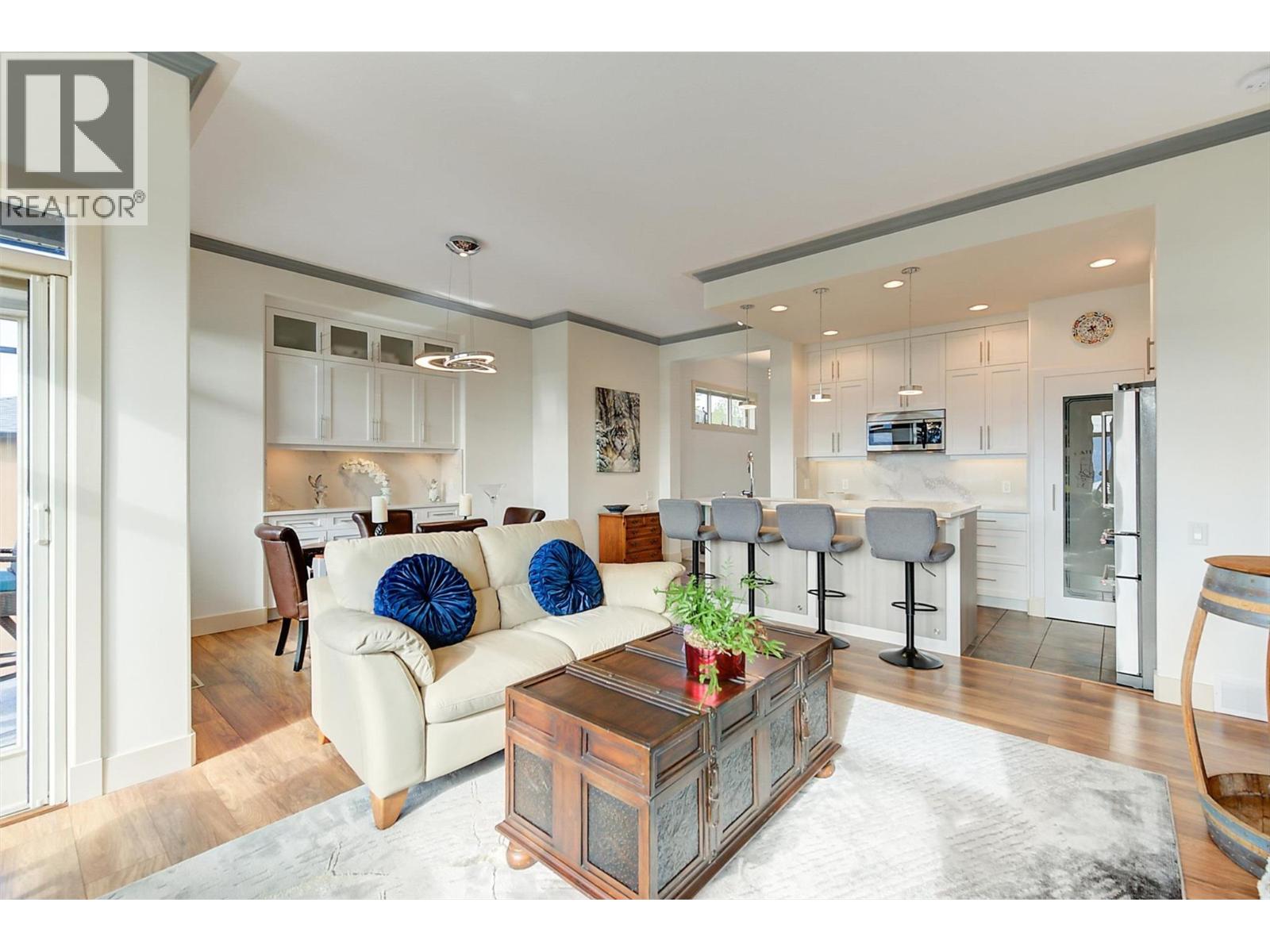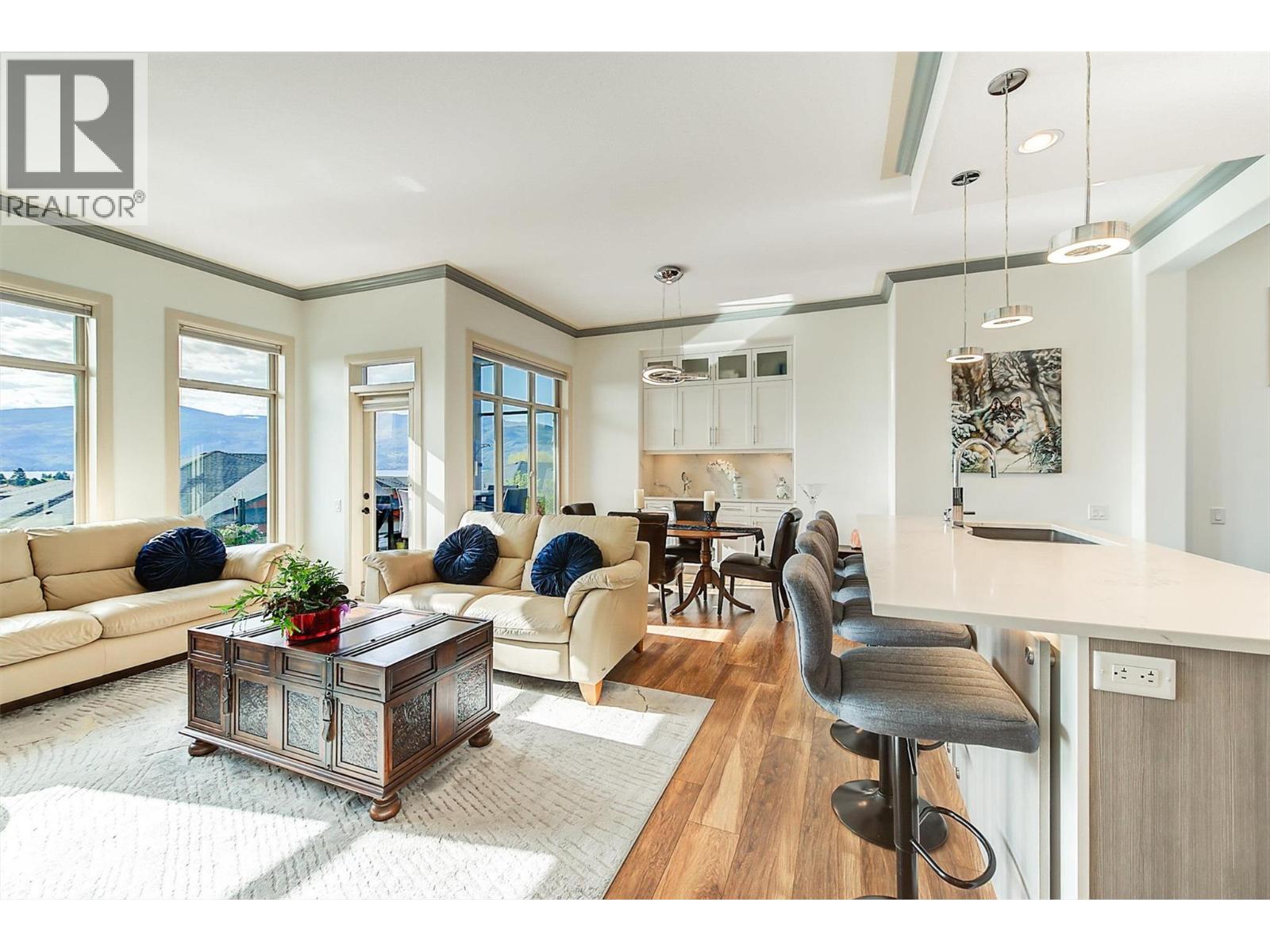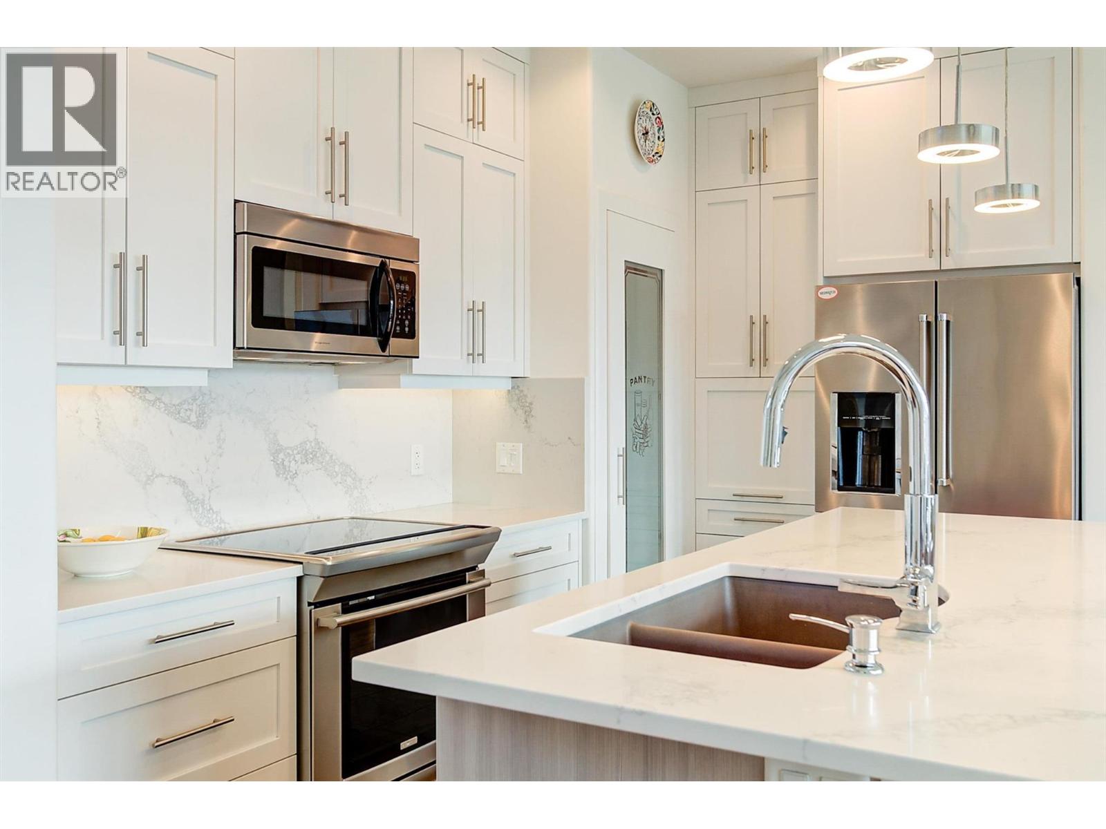 Welcome to this beautifully updated semi-detached townhome in the highly desirable Sonoma Pines community! Step into the stylish, modern custom kitchen featuring white shaker-style soft-close cabinets extended to the ceiling, sleek quartz countertops, stainless steel appliances, a convenient coffee station, a wave-activated Moen kitchen faucet, and updated lighting. The open-concept living room boasts newer laminate flooring, a cozy gas fireplace, and stunning lake views. Adjacent, the dining room includes custom built-in cabinetry and opens onto a spacious deck with topless glass railings—perfect for soaking in the panoramic lake views. The deck also comes equipped with gas hookups for BBQ. The bright and inviting primary bedroom features lake views, newer carpet, a walk-in closet, and a 4-piece ensuite with Corian counters. A second bedroom, full bathroom, and convenient laundry area complete the main floor layout. Downstairs, you'll find a spacious family room with an electric fireplace, a flex room ideal for a home office or gym, a third bedroom, another full bathroom, a large storage room, and access to a lower covered patio with hot tub hookup—perfect for year-round enjoyment. Additional highlights include a double garage, flat driveway, and low-maintenance living in a fantastic location close to golf, shopping, and Okanagan Lake. Sonoma Pines amenities include a clubhouse with gym, library, billiard room, and sizeable social room with a full kitchen available to rent. Secure RV parking is also available on-site. This is the perfect blend of comfort, style, and breathtaking views—don’t miss it. NO PTT, PREPAID LEASE. (id:6770)