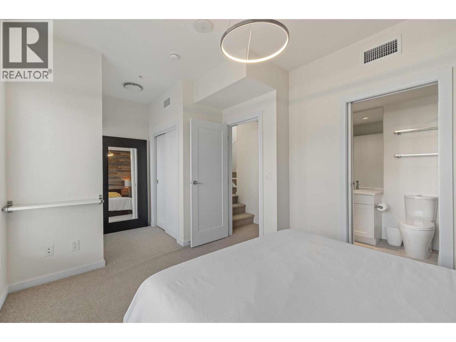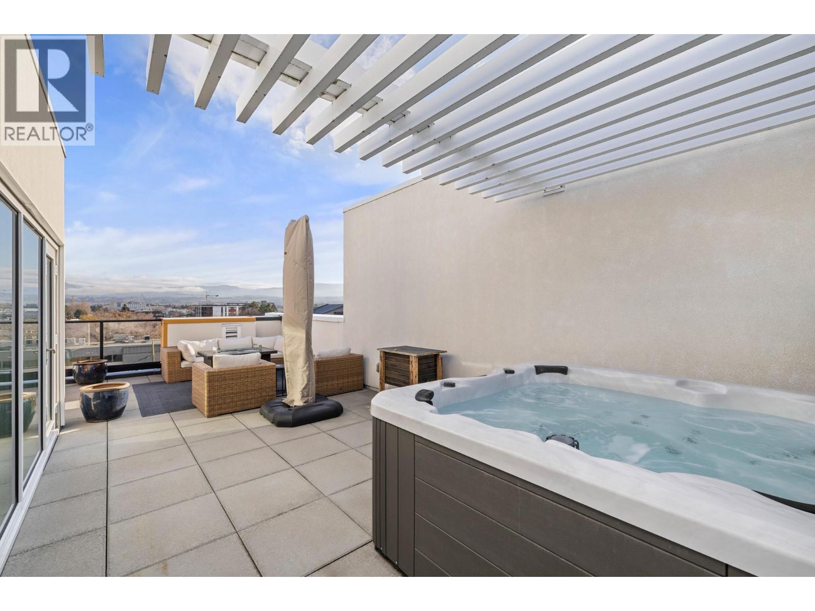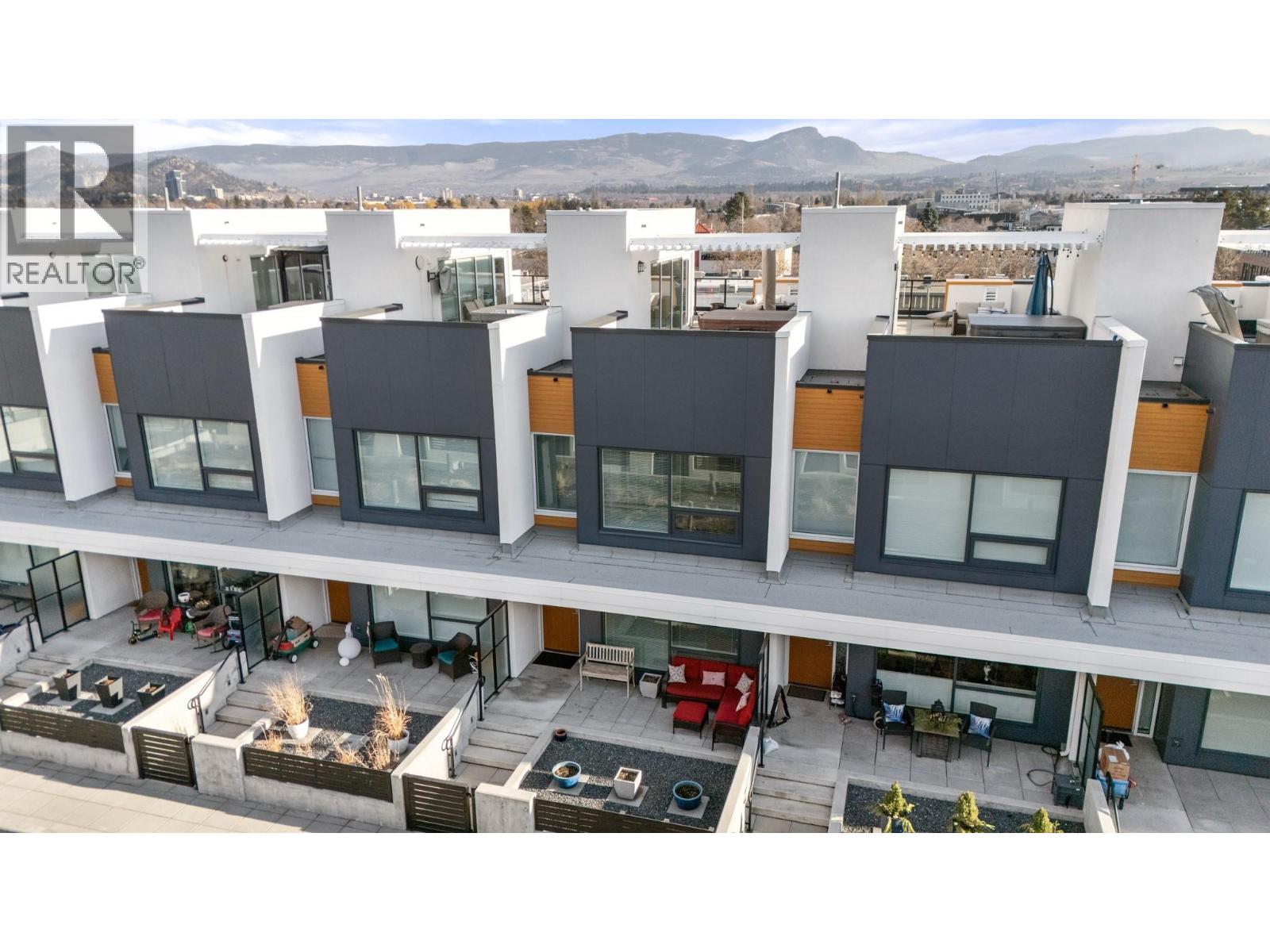 Welcome to luxury living at SOPA Square. This exceptional townhouse-style residence offers breathtaking mountain views, beautiful eastern exposure with glowing morning light, and rare privacy—highlighted by your own rooftop deck complete with a hot tub and peek-a-boo lake views. The interior delivers a true boutique, high-end feel with premium Wolf and Fisher & Paykel appliances, a massive kitchen island, and an open-concept layout that flows seamlessly to a spacious outdoor deck—perfect for entertaining or unwinding against a stunning mountain backdrop. Featuring two generous bedrooms, each with its own ensuite, plus a large den easily convertible to a third bedroom, this home lives large and feels private with its own entrance and patio. Enjoy the convenience of two secure parking stalls with extra-high ceilings—ideal for oversized vehicles and trucks. Set within a safe, secure, and beautifully landscaped third-level courtyard, residents also enjoy access to SOPA’s first-class amenities including a lakeview lap pool, hot tub, gym, fire pit lounge, and private boardroom. All of this is located in the vibrant Pandosy Village, just steps to boutique shopping, restaurants, coffee shops, yoga studios, and more. (id:6770)