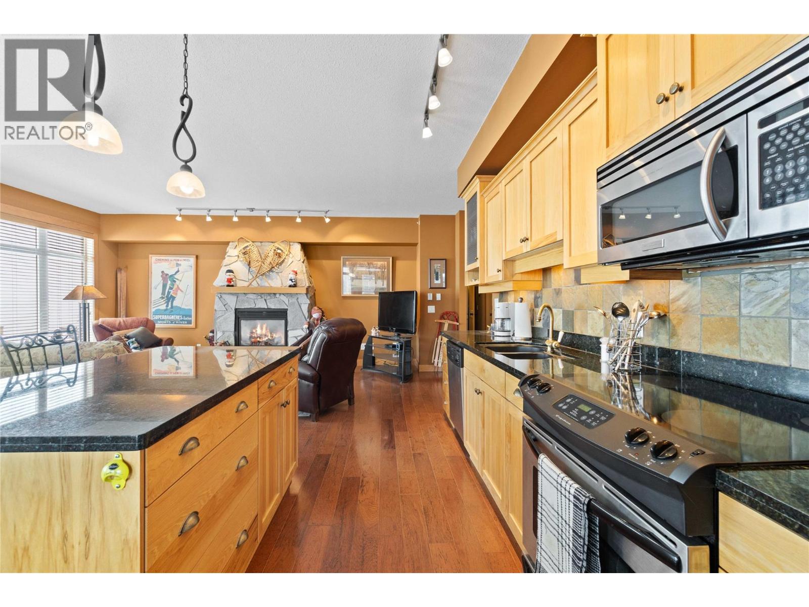 Top floor corner unit ski chalet with unobstructed views in Big White's favorite boutique building: Glacier Lodge. This ski in/out former show home boasts 2 bd + 2 bath; has simply incredible views of the valley, Monashees and weekly fireworks. Easy access with a ski bridge 25 steps to your front door. 2 secure underground parking stalls & 2 ski storage lockers just steps from the unit. Centrally located right on Happy Valley Way you are just mins to the village or gondola. Private hot tub/balcony. In-suite laundry. Stainless appliances, granite counters. New fridge+microwave. Hardwood floors, heated slate tiles, steam shower. Spacious entry, stone fireplace and over height ceilings. Smart floor plan with space to entertain or host family. Rarely used by the Owner, the unit has never been rented, well-run strata and the unit is in excellent condition. No rental restrictions or revenue share required. Sold turn key, ready to occupy for Jan 1 with all furniture, decor and linens/sundries. Sleeps 8. Newer washer/dryer, h/w tank, vacuum and under-cabinet lighting. Measurements are approx. (id:6770)