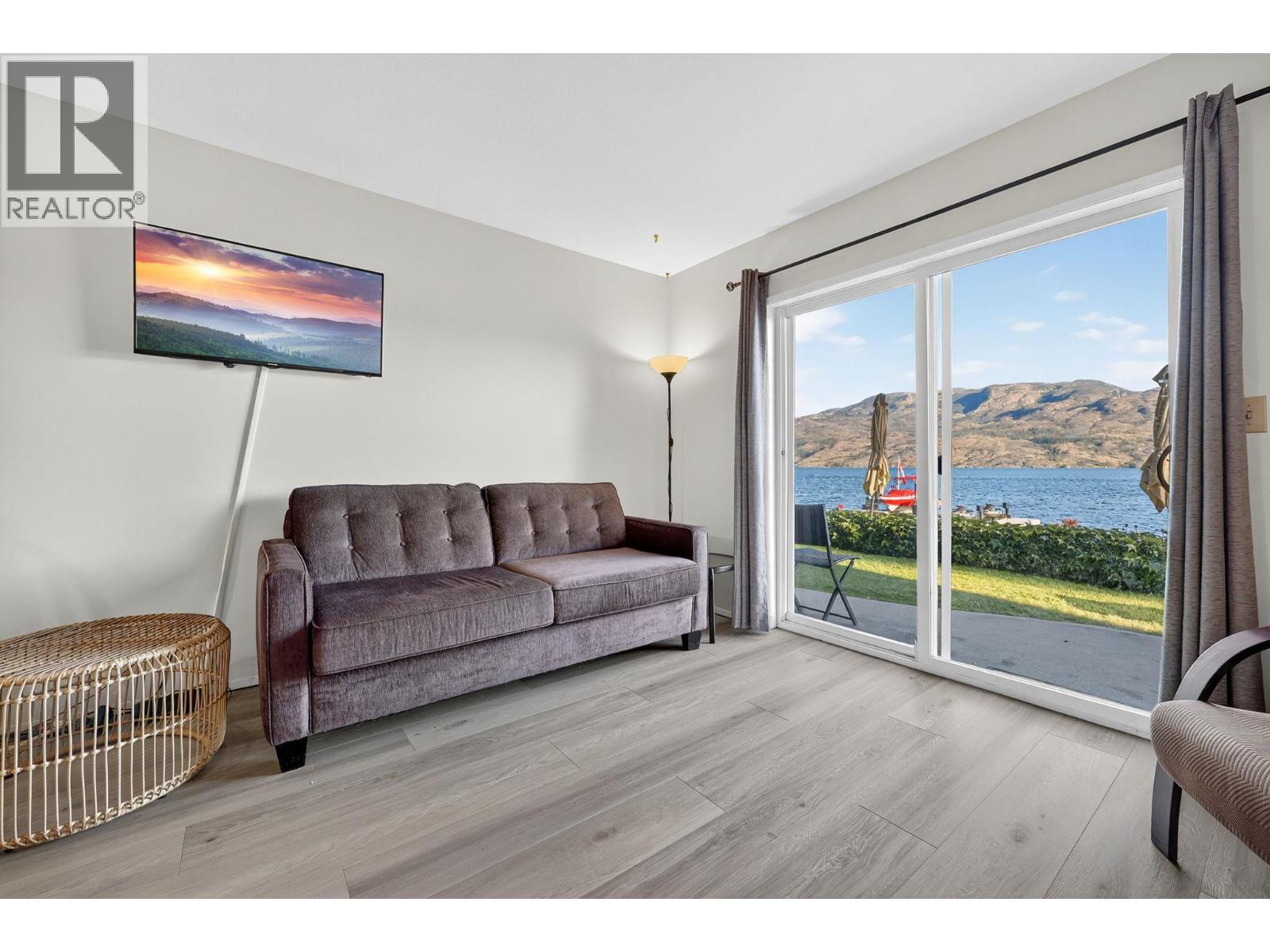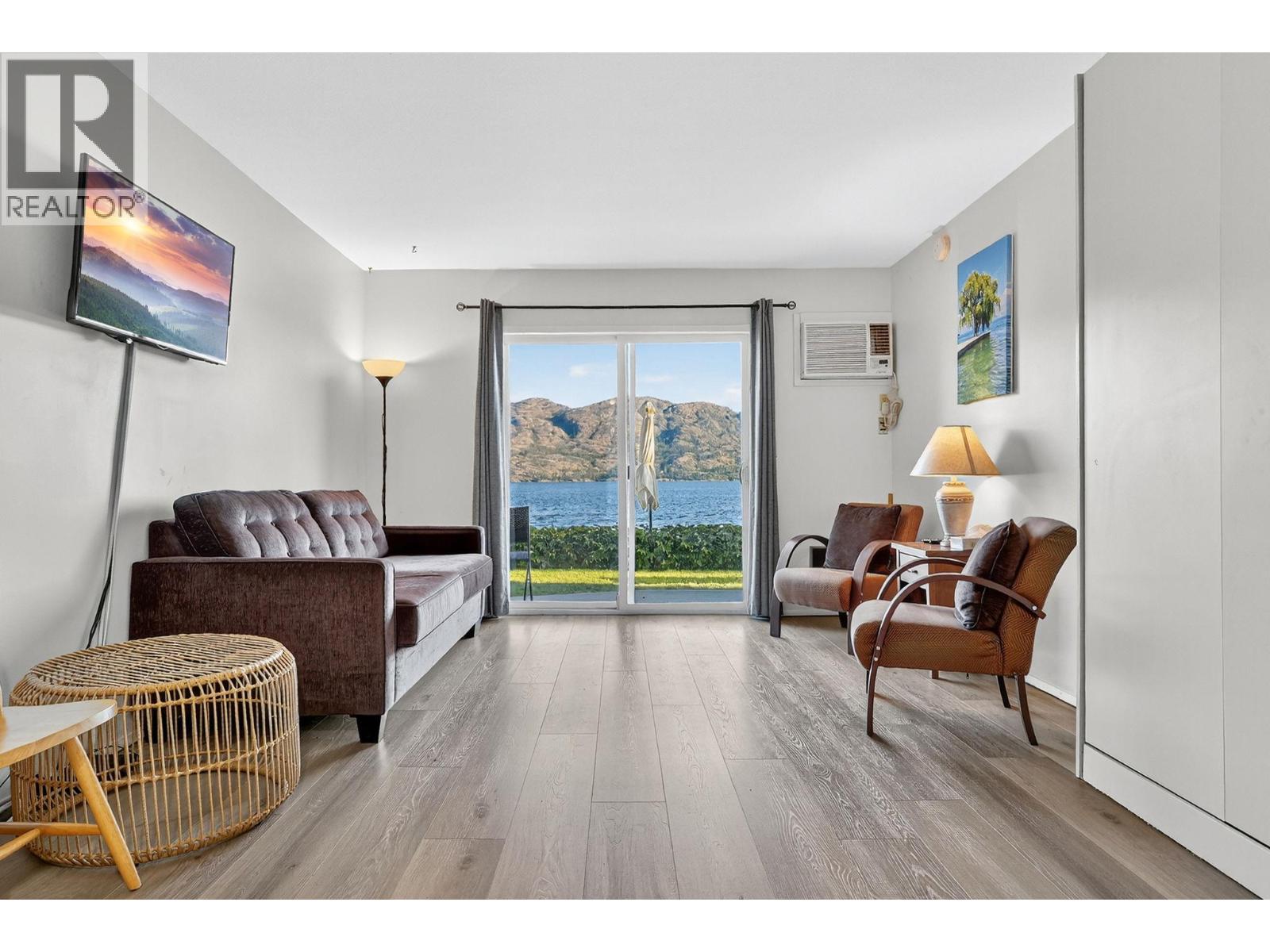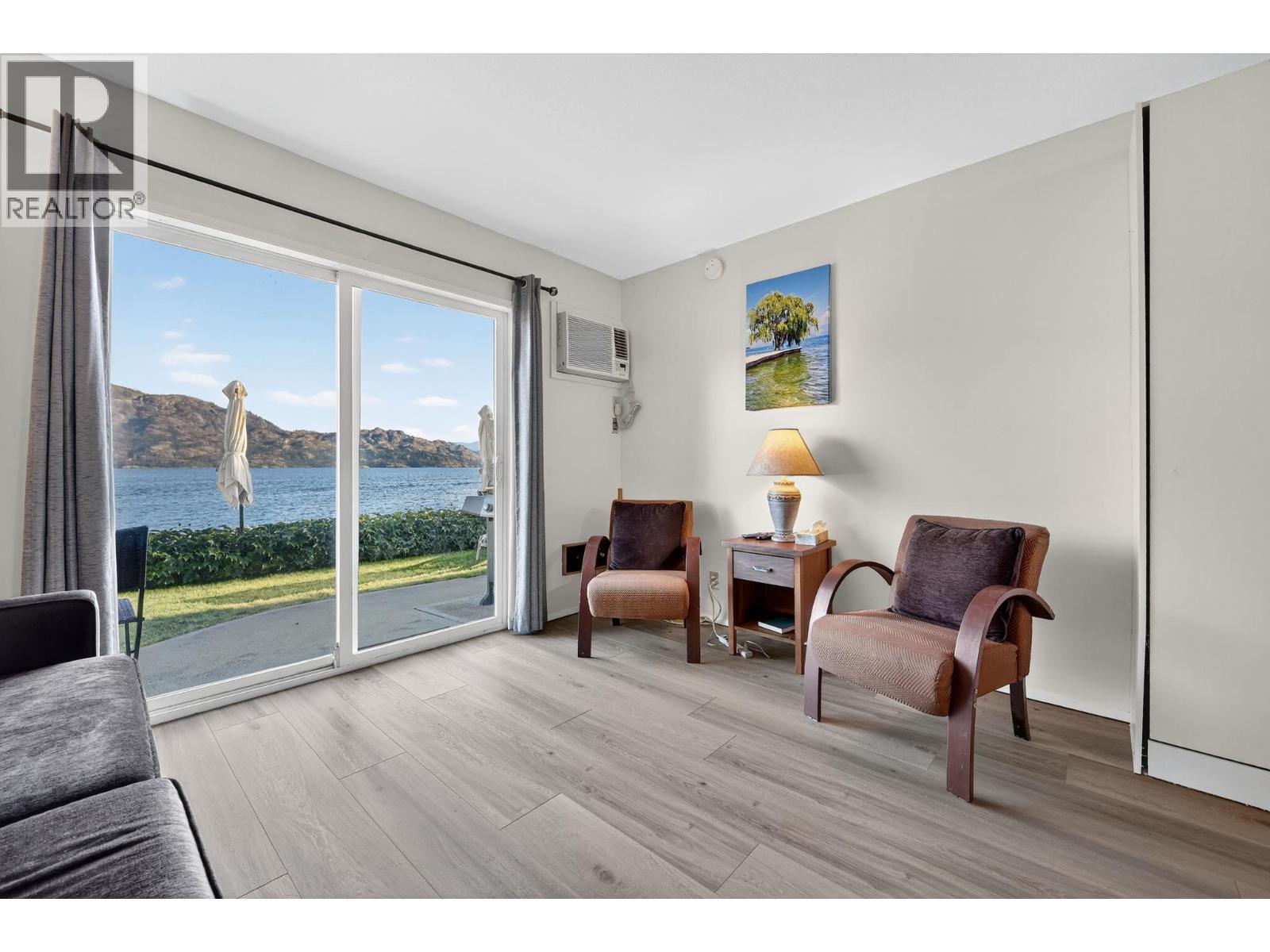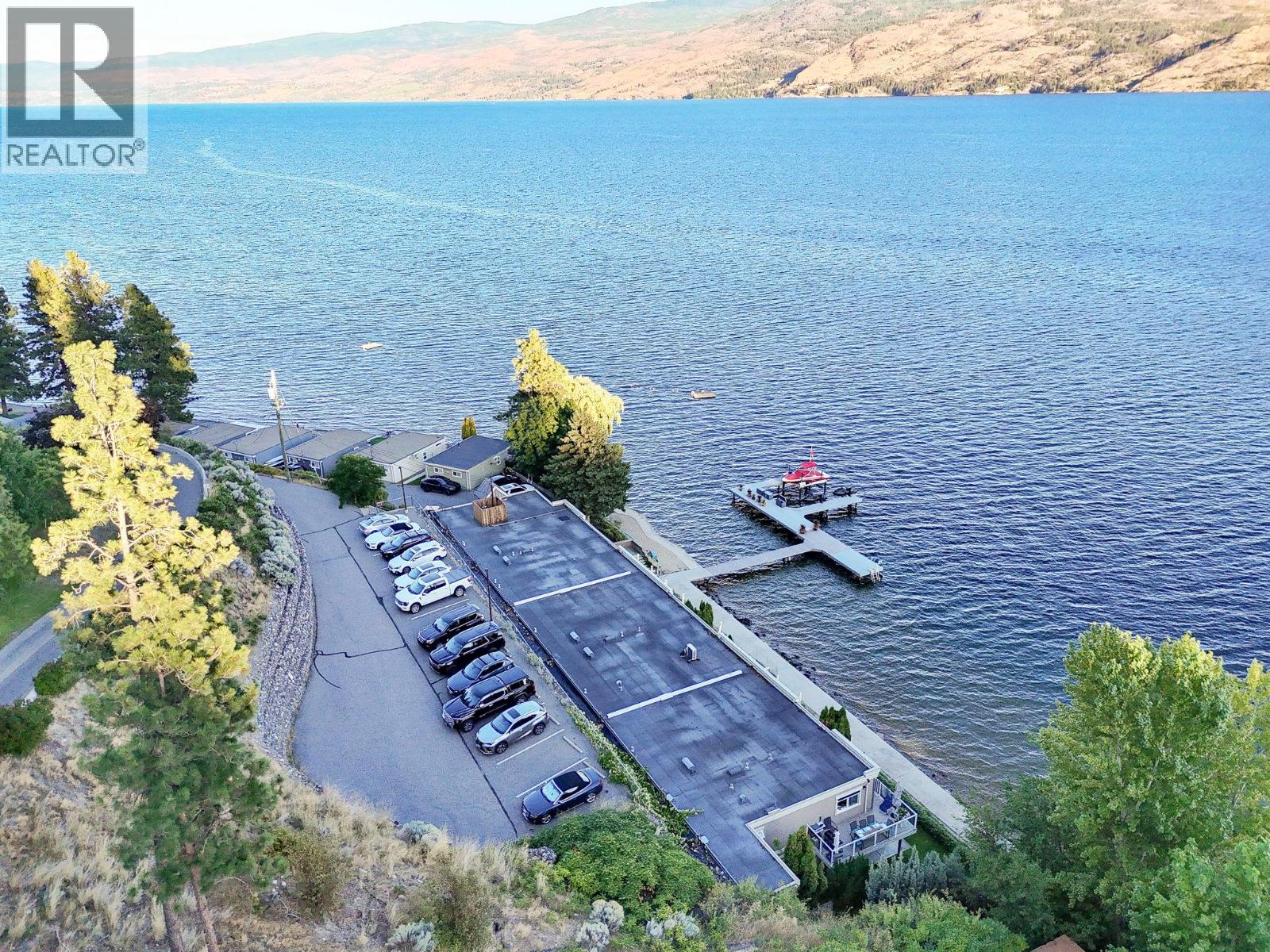 Own your own piece of Okanagan lake front! Best kept secret in the area. This open concept, air conditioned condo in a secure gated community has everything you need to spend your summers on the lake. Sleeps 4, fully furnished, with a new hide a bed, a murphy bed with a new mattress, newer smart TV, tables, chairs and even pots, pans, dishware, glasses, cutlery and a BBQ. New laminate flooring this past year. Wake upright beside the lake and enjoy the lakefront breeze while having a morning cup of coffee on your patio beside the water. Extra storage and 1 assigned parking spot. The resort life comes with many amenities such as boat moorage in the private marina, a clubhouse, private shared dock, boat launch, boat trailer parking, fire pits, coin laundry and ice machine. Telus fibre optic WIFI is available and for extra security the marina and guest parking is monitored by cameras. Great for rental income when you aren't using it yourself. Come see for yourself what lake life can be like. Don't miss out on this great opportunity. These units don't come up for sale very often. (id:6770)