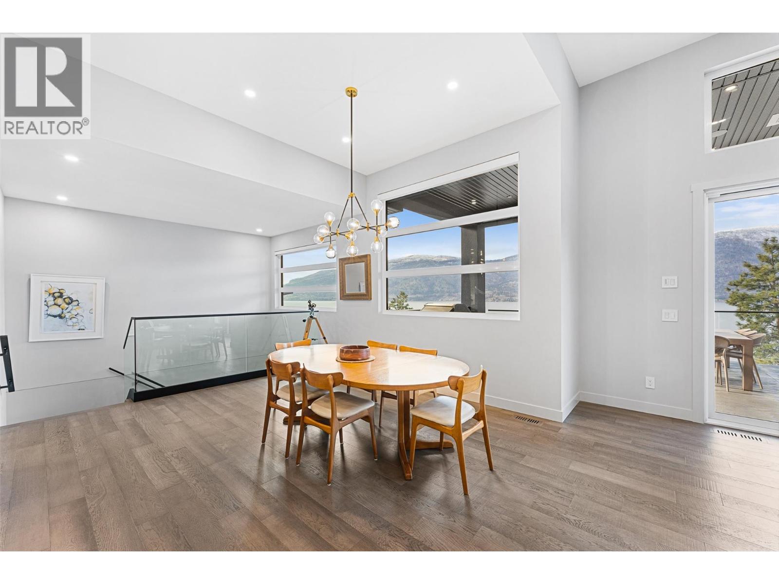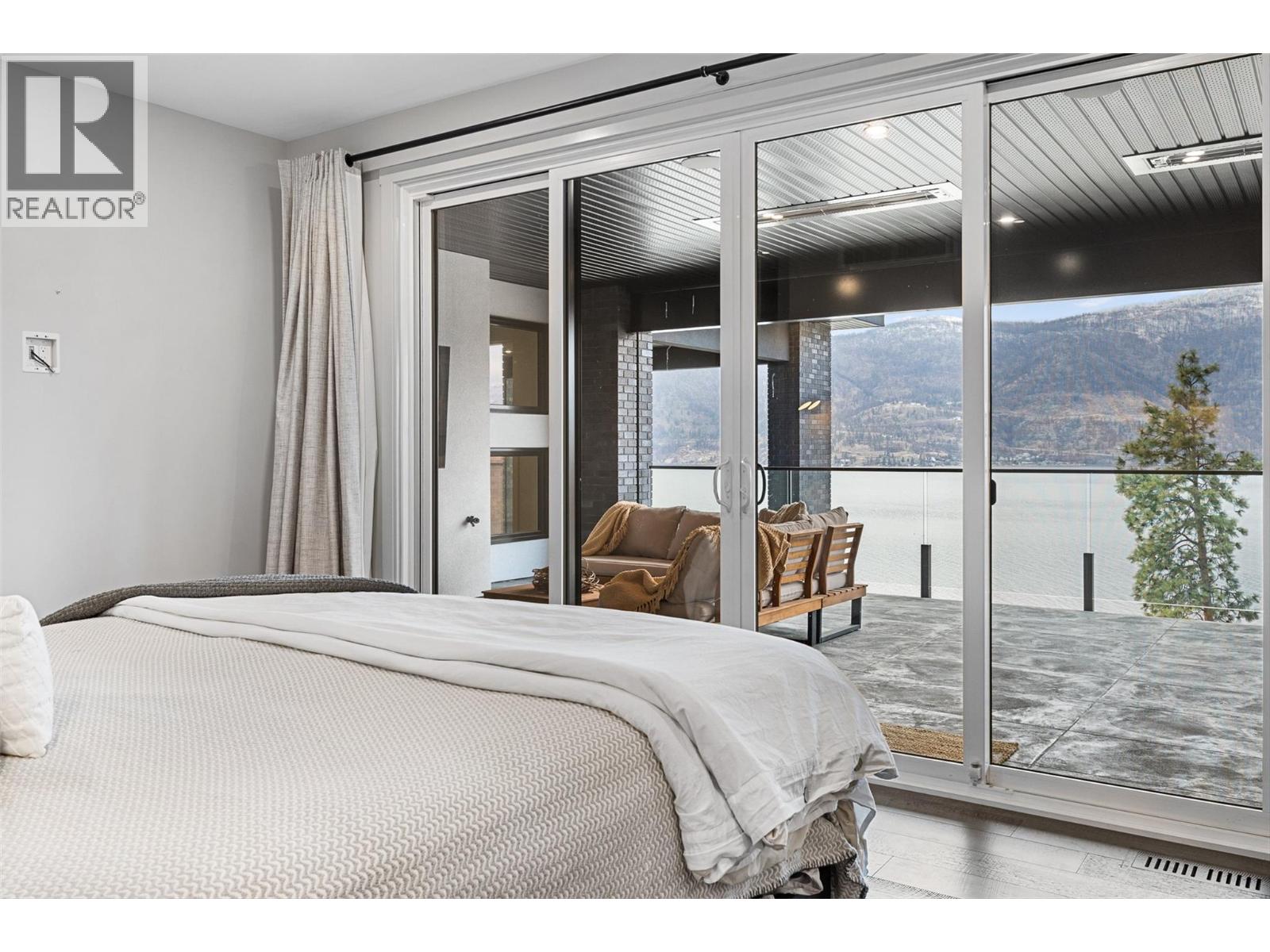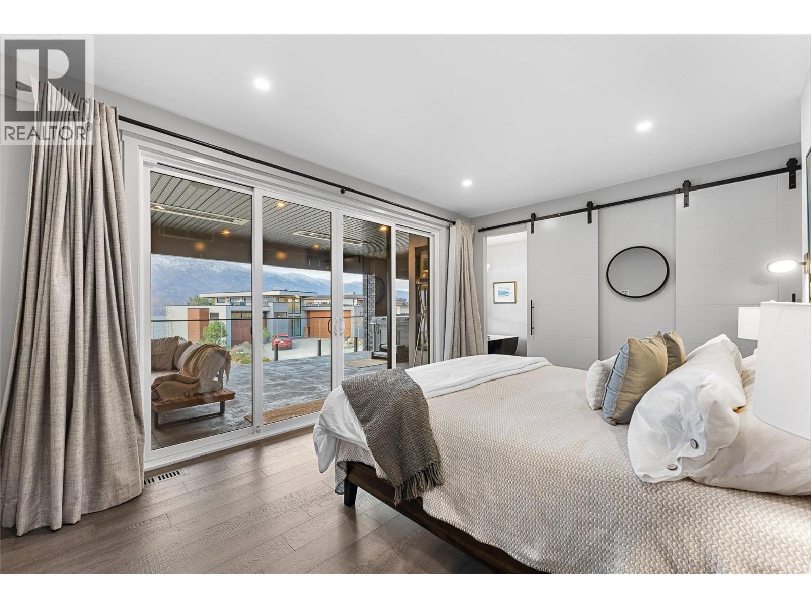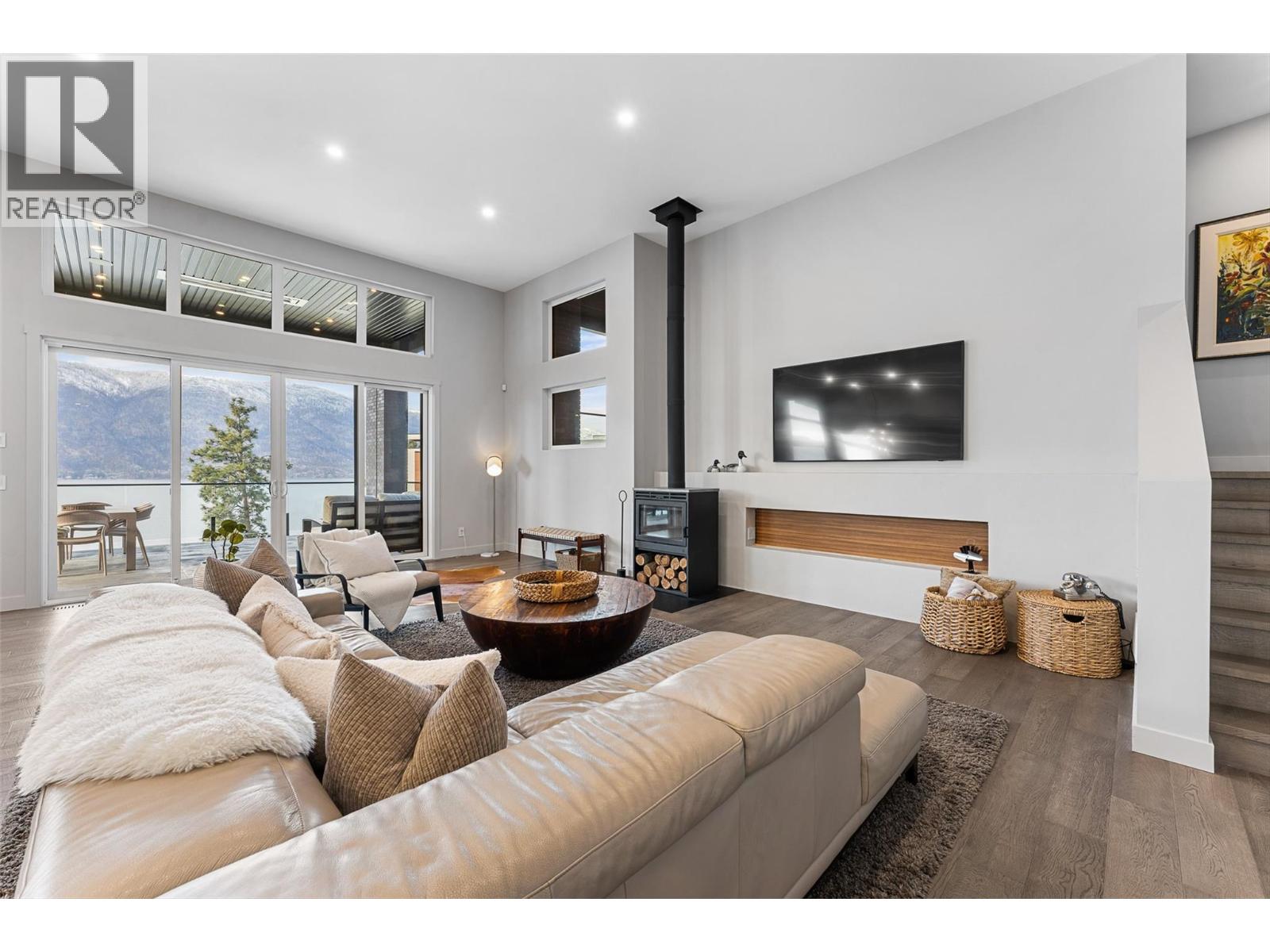 Set on a quiet no-through road in McKinley Beach, this contemporary residence offers a rare sense of privacy paired with uninterrupted views of Okanagan Lake. Designed across 3 levels, the home showcases soaring ceilings, wide-plank hardwood floors, and expansive walls of glass that capture sweeping lake and mountain vistas. The main level is anchored by a dramatic great room with a wood-burning stove and floor-to-ceiling windows, seamlessly connecting to the chef’s kitchen. Here, an eight-burner Fisher & Paykel gas cooktop, two Bosch wall ovens, oversized island and full butler’s pantry with built-in appliances makes entertaining effortless. The dining area opens to a covered deck with glass railings, in-ceiling heaters, integrated speakers, an inviting space to enjoy the view year-round. Two bedrooms with a shared bath located on this level. Upper floor is dedicated to the primary retreat, featuring a private patio with hot tub, a spa-inspired five-piece ensuite with freestanding soaker tub, and a walk-in closet with custom built-ins. A rooftop patio with turf expands outdoor living. Below, the lower level offers a fourth bedroom, mudroom, and a versatile recreation room with two oversized garage doors, ideal for a home gym. Two car garage with epoxy floors, potential for a 4 car garage. Hunter Douglas electronic blinds, Lutron lighting, and Honeywell Home security. Residents enjoy access to McKinley’s amenity centre with pool, gym, hot tub, pickleball courts, & more. (id:6770)