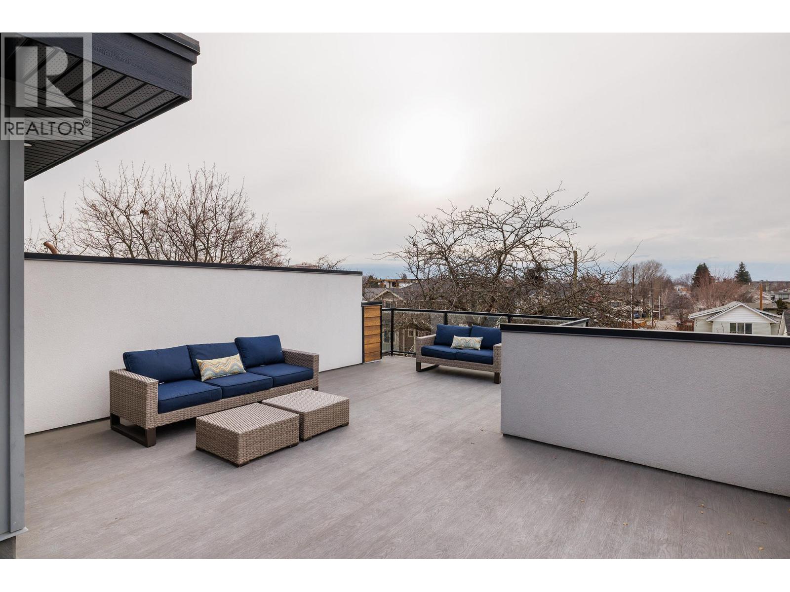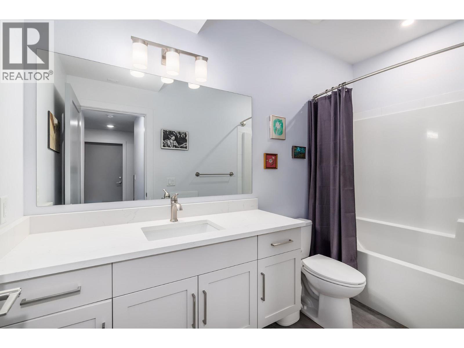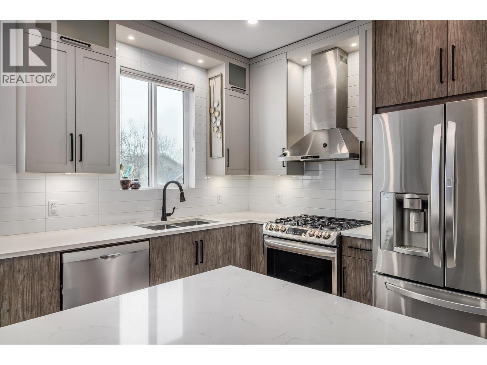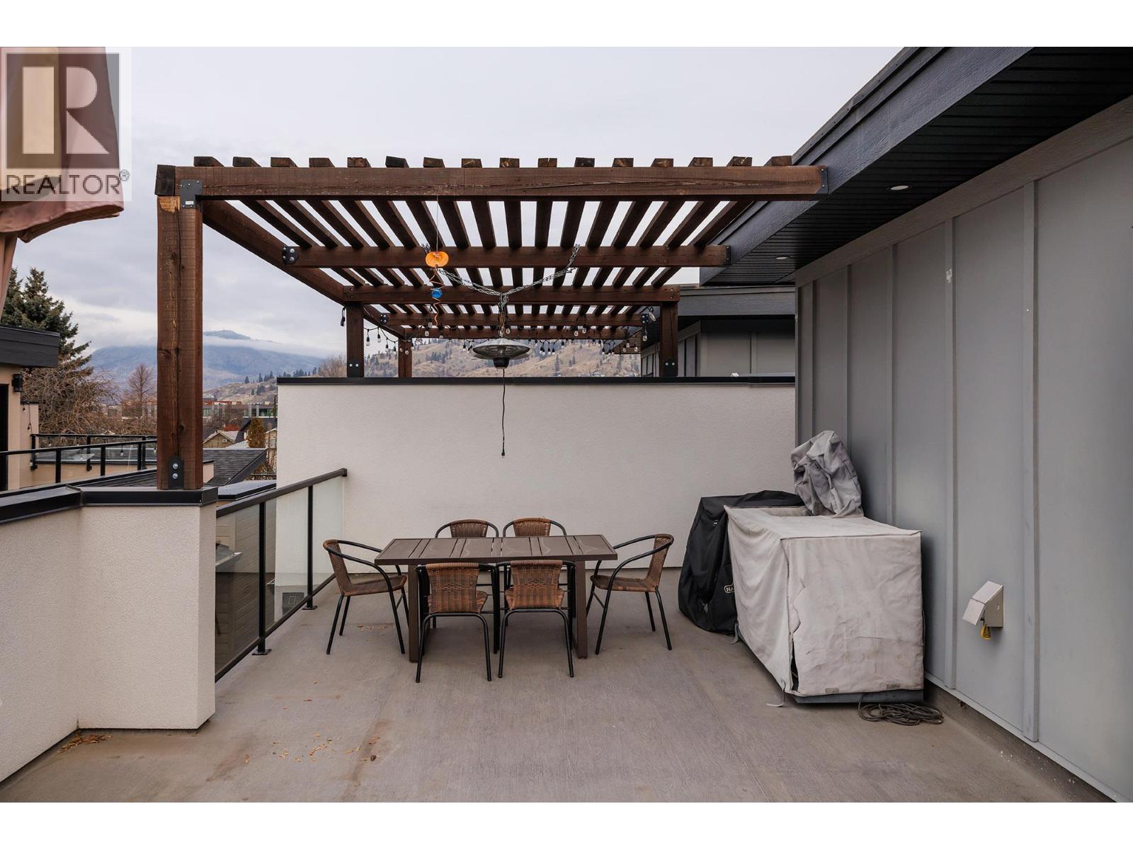 A thoughtfully designed two-level townhome in downtown Kelowna, blending modern style with everyday comfort. The entry level offers two bedrooms with built-in closets, a four-piece bathroom, dedicated laundry, and an attached single-car garage with polished concrete floors, plus an additional outdoor parking space. The main living level features a bright open-concept kitchen, dining, and living area with wide vinyl plank flooring throughout. The kitchen is finished with quartz countertops, ceiling-height cabinetry, a white tile backsplash, peninsula seating, undercabinet lighting, and stainless steel appliances, including an LG gas range and French door refrigerator. The primary bedroom is also located on this level and includes a walk-in closet and a spa-inspired ensuite with heated tile floors, floating vanity with two sinks, and a tiled walk-in shower. A stylish powder room completes the floor. Above, the expansive rooftop patio offers glass railings, city and mountain views, Duradek surfacing, a pergola for shade, and plenty of space for dining and lounging—perfect for summer evenings and entertaining. (id:6770)