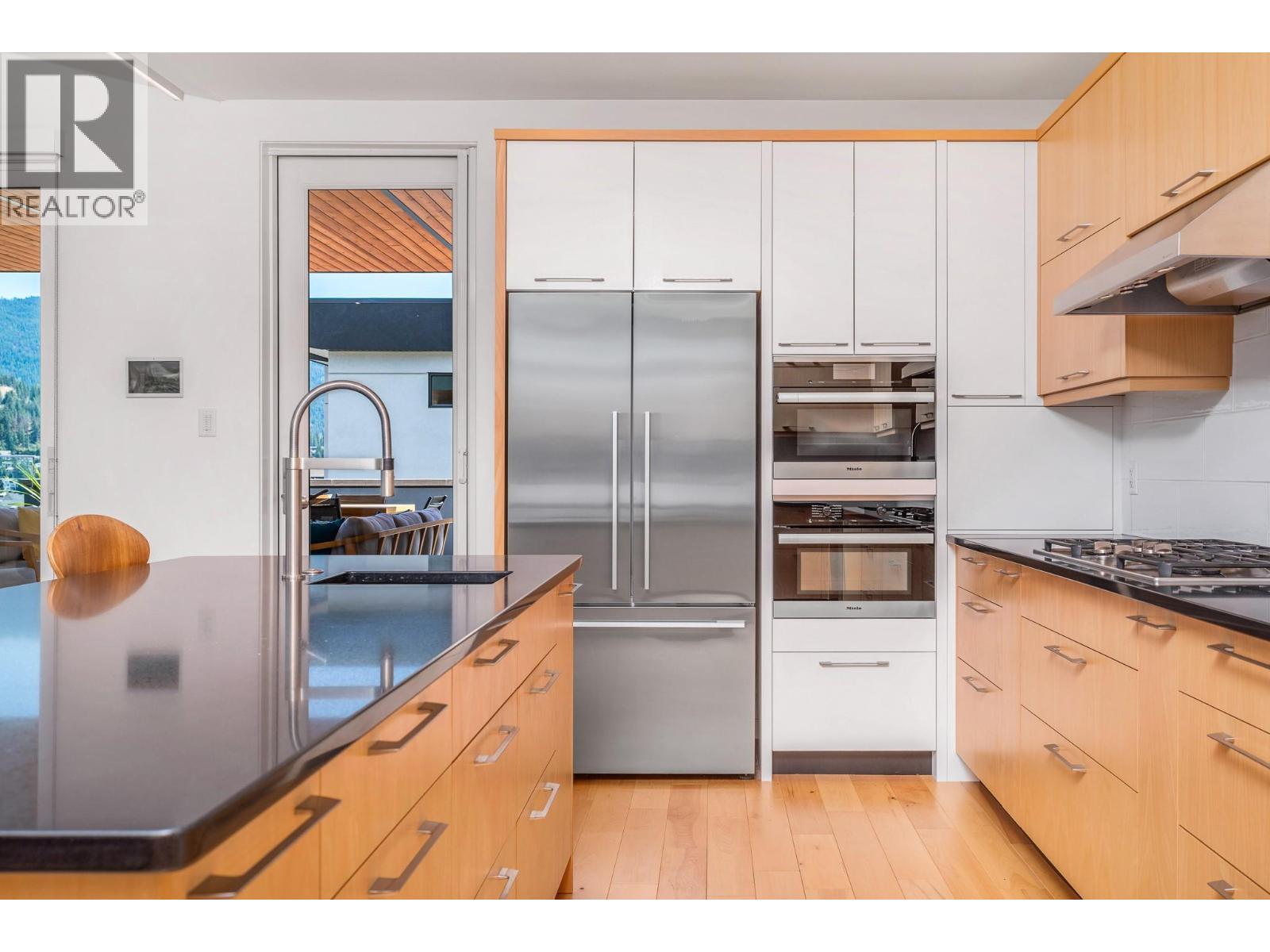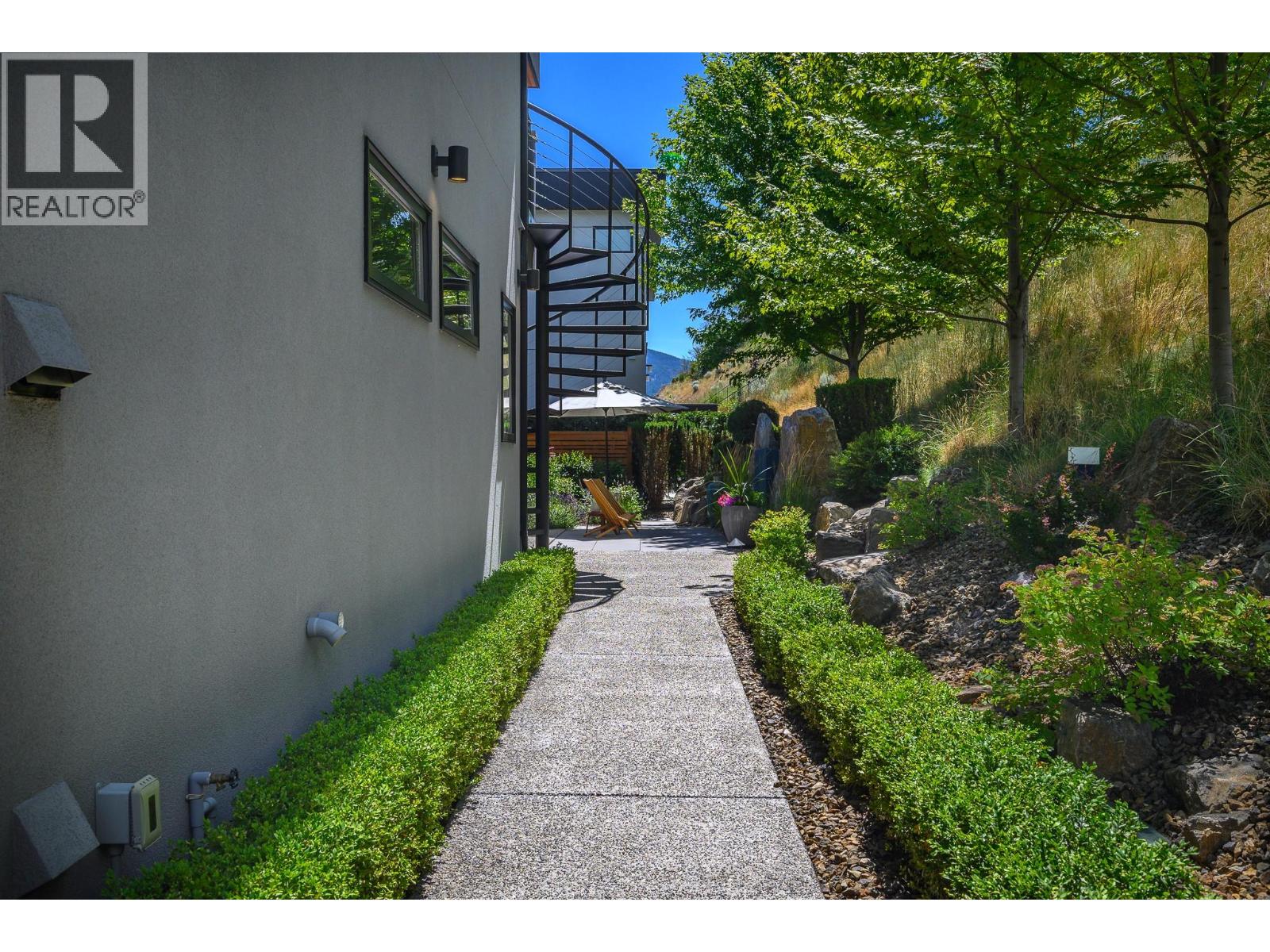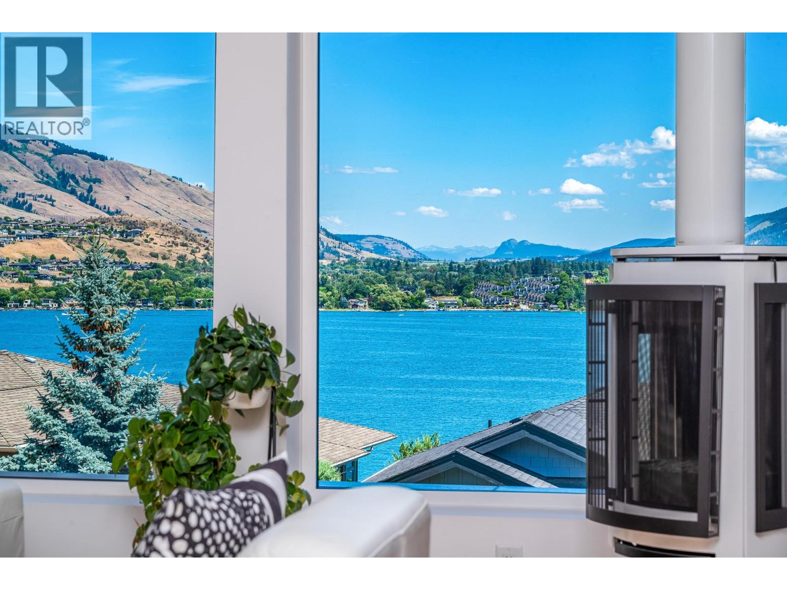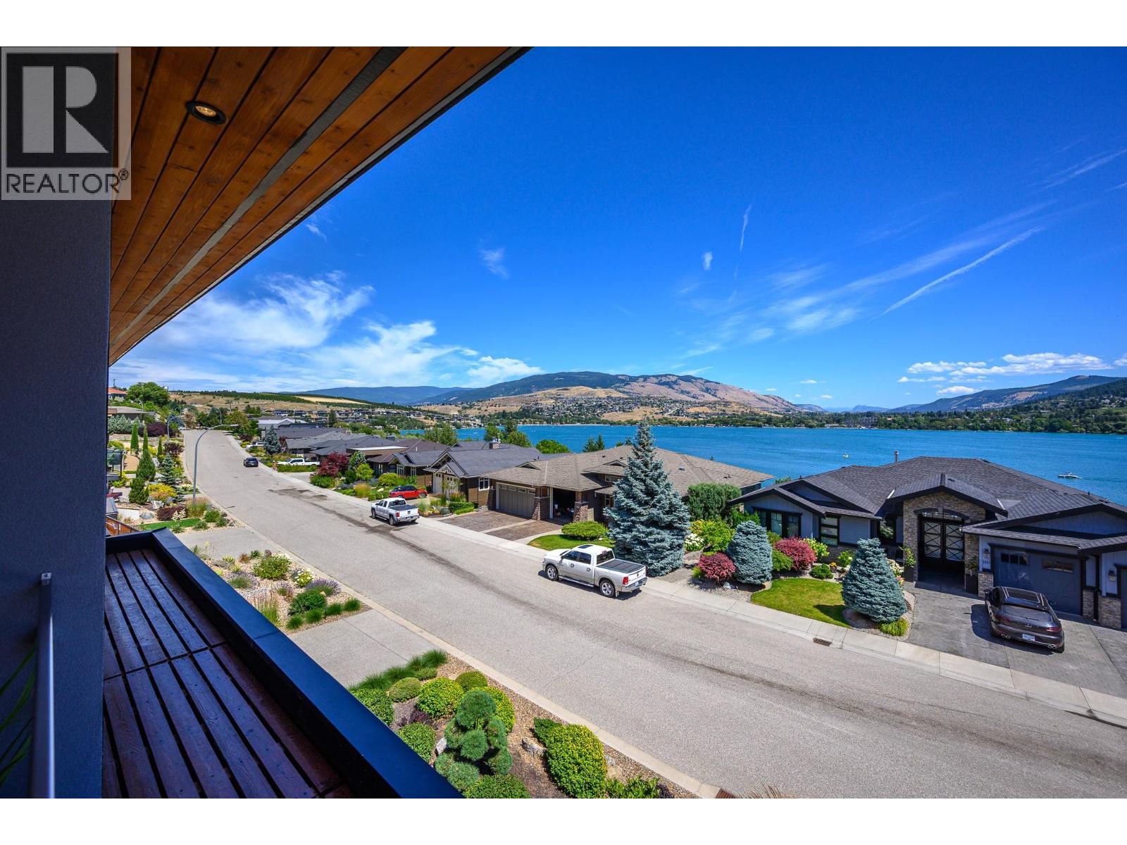 Drawing inspiration from Frank Lloyd Wright, this architecturally stunning home blends modern elegance with intelligent, future-forward design. Thoughtfully designed for aging-in-place, this home features a private elevator, wide doorways, and a barrier-free, sill-less shower, allowing the home to adapt seamlessly through every stage of life. The striking exterior showcases custom metal privacy screens, cedar soffits with integrated pot lighting, concrete planters, and exposed aggregate pathways with built-in stair lighting. A spacious covered deck with glass railings captures breathtaking views of Kalamalka Lake, the Coldstream Valley, and the Monashee Mountains. Inside, 2x8 double-staggered stud construction, 9-zone radiant in-floor heating, and extensive home automation provide comfort and efficiency. Systems control lighting, blinds, water sensors, sound, TV, security cameras, climate, and home monitoring. Beech plank and tile flooring flow throughout, with rubberized tile in the gym. The top-floor kitchen features premium Miele appliances, black quartz countertops, and a large island. The open living and dining area opens to a partially covered deck with BBQ hookup and ceiling heater. The primary suite offers patio access, steam shower, dual vanity, and built-ins. Two additional bedrooms, full bath, den, office, and gym complete this exceptional smart home, finished with integrated storage, epoxy garage, ductless A/C, HRV, humidifier, and hot water boiler. (id:6770)