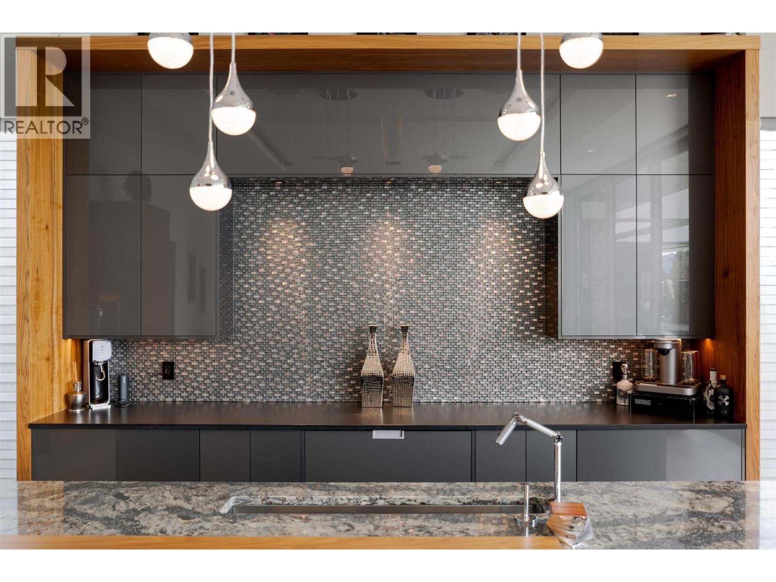 Discover unparalleled luxury at this magnificent custom Okanagan home. As you pass through the gate, you'll immediately be captivated by its design. The modern aesthetic seamlessly integrates the home with its landscaping, creating a harmonious experience. The entry features a mesmerizing floating roof design inspired by a museum in Spain, and light filled courtyard to display custom artwork Inside, entertain at the custom bar, enjoy a cinematic experience in the state-of-the-art home theatre, and store your prized vintages in the 1,500-bottle wine room. For seamless indoor to outdoor living all the sliding doors open to a completely private backyard offering a sensational living experience: prepare a culinary feast in the outdoor kitchen, lounge by the expansive saltwater vanishing edge pool, or soak in the hot tub, all while enjoying the relaxing ambiance of the waterfall and 180-degree views of Okanagan Lake. Take the floating walnut staircase or the elevator upstairs. The primary bedroom is a retreat like no other, with a private patio, luxurious lake view en suite, and a stunning custom closet. Three additional bedrooms each have their own en suite. For the car enthusiast, this home boasts 2 levels of garages with parking for 7+ vehicles. Exquisite finishes include porcelain tile floors, Cambria quartz, &unmatched glass and walnut woodwork by Shawn Truit. This custom home stands as a masterpiece of design and engineering. (id:6770)