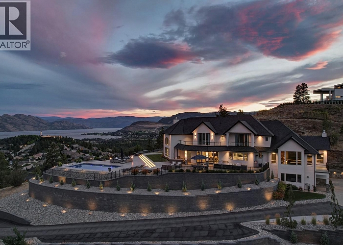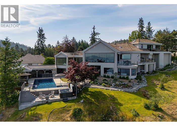 Truly beyond compare! Gorgeous custom home in the desirable private gated neighborhood of Vineyard Estates. From this residence you will enjoy remarkable panoramic views of Okanagan Lake, rolling hills, mountains, & vineyards, including the bell...